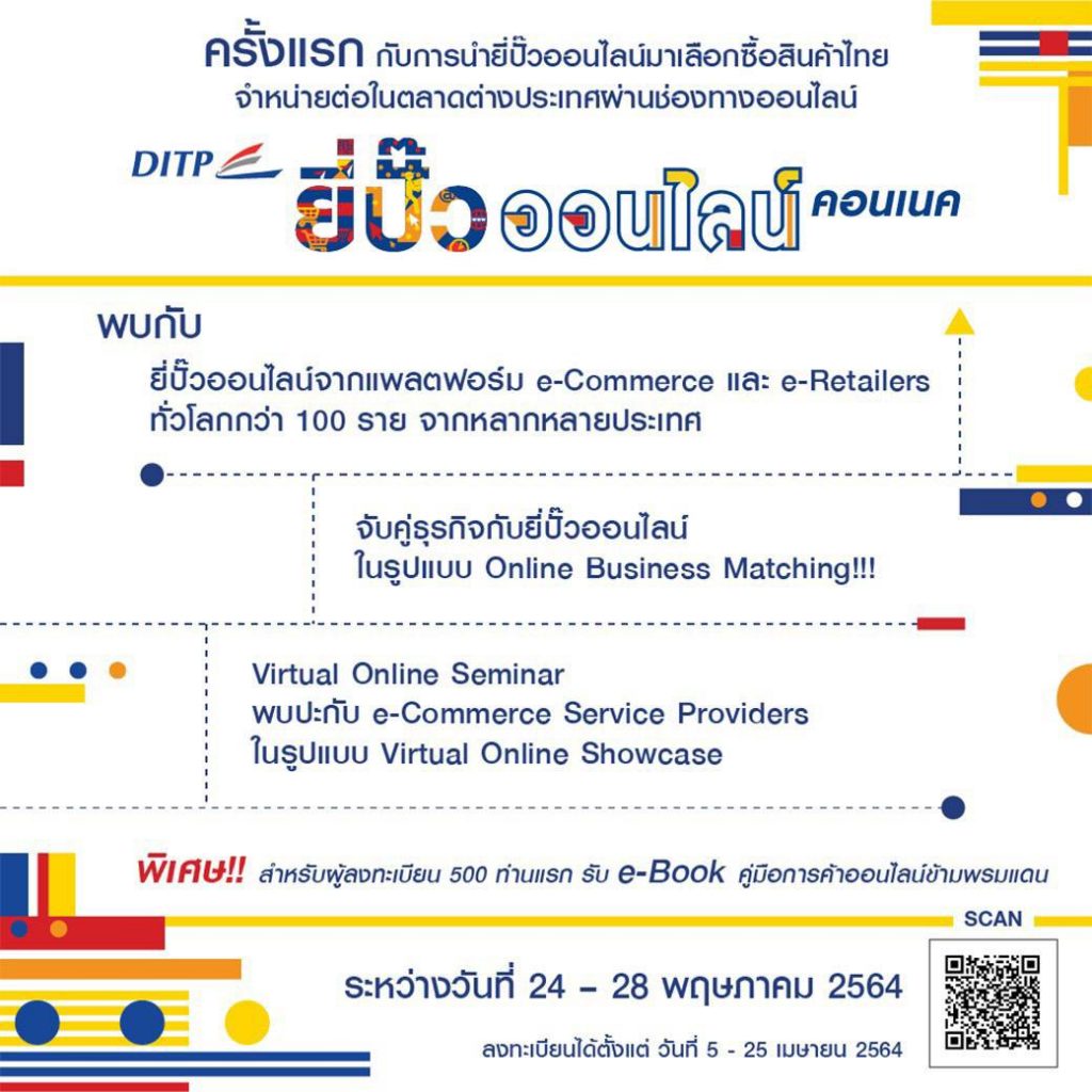 กรมส่งเสริมการค้าระหว่างประเทศ กระทรวงพาณิชย์ นำยี่ปั๊วออนไลน์กว่า 70 ราย จากแพลตฟอร์ม e-Commerce และ e- Retailers ทั่วโลก อาทิ Amazon (ตลาดอเมริกา) Tmall (ตลาดจีน) Didi Global (ตลาดจีน) Bigbasket (ตลาดอินเดีย) รวมทั้ง จากอาร์เจนตินา,รัสเซีย,ไต้หวัน,เวียตนาม และไนจีเรีย ฯลฯ มาเลือกซื้อสินค้าไทยไปจำหน่ายบนแพลตฟอร์ม e-Commerce ต่างประเทศ ในงาน “DITP ONLINE RESELLERS CONNECT 2021” ระหว่างวันที่ 24-28 พฤษภาคม 2564 ในรูปแบบ Virtual e-Commerce Event เต็มรูปแบบ อัดแน่นด้วยกิจกรรมจับคู่ธุรกิจการค้าการยี่ปั๊วออนไลน์ในรูปแบบ Online Business Matching การสัมมนาแบบออนไลน์ (Virtual Online Seminar) ให้ความรู้เจาะเทรนส์สินค้าในตลาดออนไลน์ และโมเดลธุรกิจ และ Virtual Online Showcase ที่พร้อมให้คำปรึกษาเกี่ยวกับ การให้บริการด้าน e-Commerce แบบทันทีในรูปแบบ Live Chat
