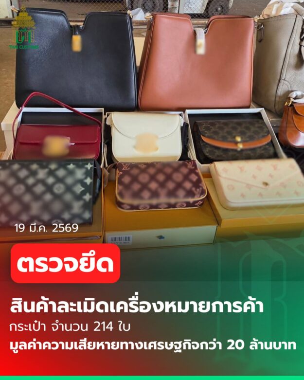 กรมศุลกากร ตรวจยึด “กระเป๋า ละเมิดเครื่องหมายการค้า เมืองกำเนิดต่างประเทศ” มูลค่าความเสียหายทางเศรษฐกิจกว่า 20 ล้านบาท