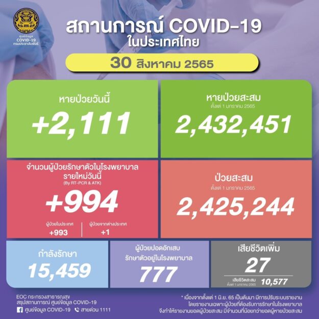 รายงานผู้ป่วยติดเชื้อโควิด-19 วันอังคารที่ 30 สิงหาคม 2565