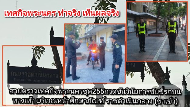 สายตรวจเทศกิจ พระนคร ชุด255 กวดขันวินัยการขับขี่รถบนทางเท้า หน้าศึกษาภัณฑ์เก่า ( ถนนราชดำเนินกลางฝั่งขาเข้า )