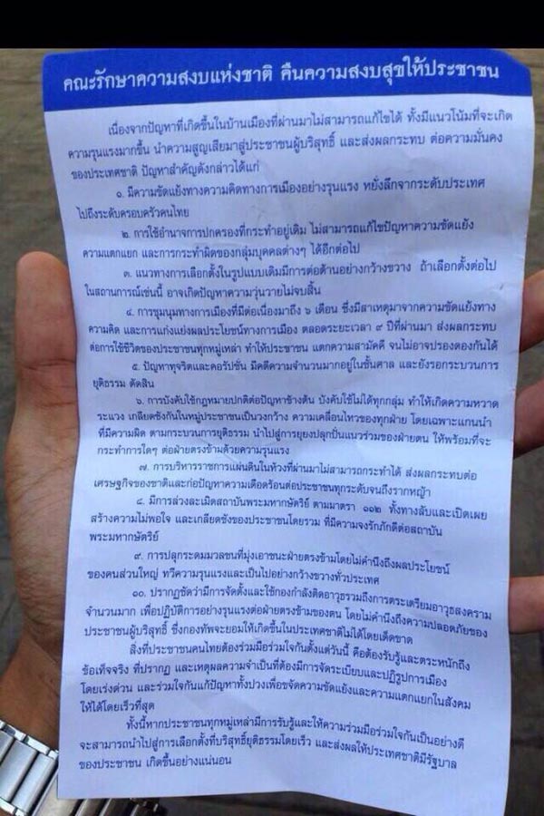 “คณะรักษาความสงบแห่งชาติ คืนความสุขให้ประชาชน” ให้กับประชาชนที่เดินผ่านไปมาในย่าน