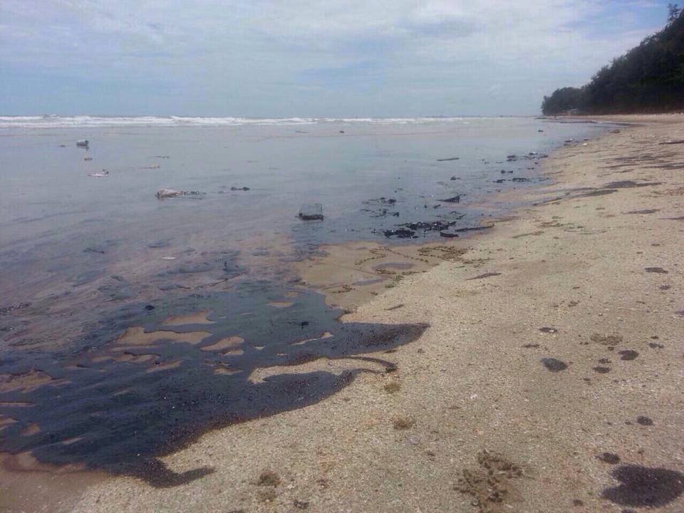 ตลอดแนวชายหาดแม่รำพึงและมีกลิ่นเหม็นฉุนแสบจมูก ซึ่งเจ้าหน้าที่ได้เก็บตัวอย่างคราบน้ำมัน