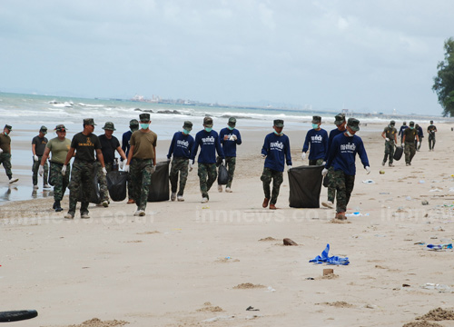 ทหารเรือ 60 นาย เข้าเก็บคราบน้ำมัน หาดแม่รำพึง จ.ระยอง ขณะ ผอ.สำนักทรัพยากรธรรมชาติ