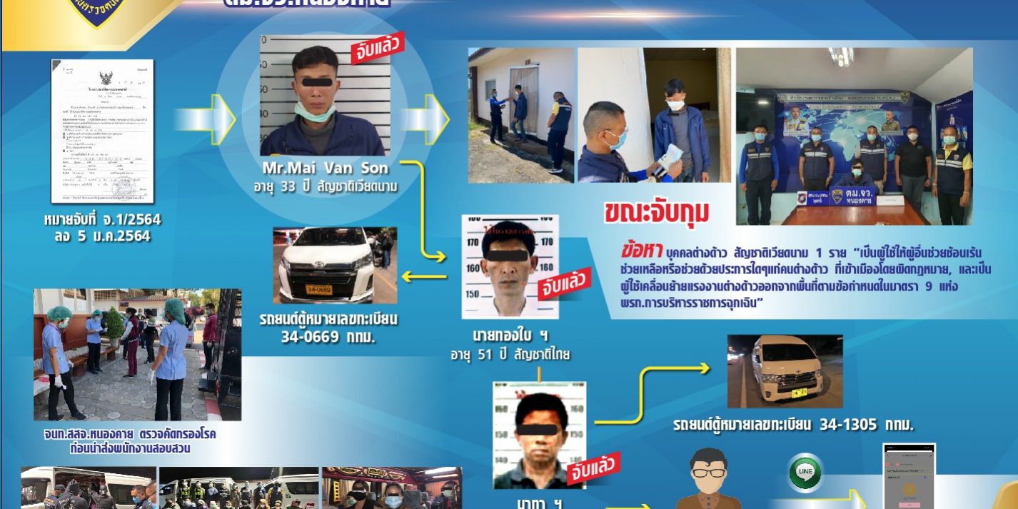 เจ้าหน้าที่ชุดสืบสวนปราบปราม ตม.จ.หนองคาย ได้นำรถยนต์ตรวจการณ์อัจฉริยะ BMW ออกลาดตระเวนเพื่อสืบสวนและจับกุมการกระทำผิดเกี่ยวกับการลักลอบเคลื่อนย้ายแรงงานต่างด้าวมาจากพื้นที่เสี่ยง จนกระทั่งพบรถยนต์ตู้ต้องสงสัยจำนวน 2 คัน ซึ่งได้ชะลอเพื่อหลบเลี่ยงการตรวจก่อนถึงจุดตรวจด่านหนองสองห้อง ต.ค่ายบกหวาน อ.เมืองหนองคาย จ.หนองคาย เมื่อพบว่ามีการตั้งด่านจึงพยายามจะกลับรถหลบหนีการตรวจสอบ จนท.ชุดจับกุม จึงได้เข้าแสดงตัวขอตรวจสอบ พบนายทองใบ อายุ 51 ปี สัญชาติไทย เป็นผู้ขับขี่รถยนต์ตู้สีขาว ทะเบียน กทม. และ นายทา เป็นผู้ขับขี่รถยนต์ตู้สีขาว ทะเบียน กทม. โดยมีแรงงานชาวเวียดนามโดยสารมาทั้งสิ้น 12 คน ตรวจสอบพบว่าเป็นผู้กระทำความผิดฐานหลบหนีเข้าเมือง 2 คน และอยู่เกินกำหนดจำนวน 6 คน จึงได้ควบคุมตัวมาสอบสวนที่ ตม.จ.หนองคาย