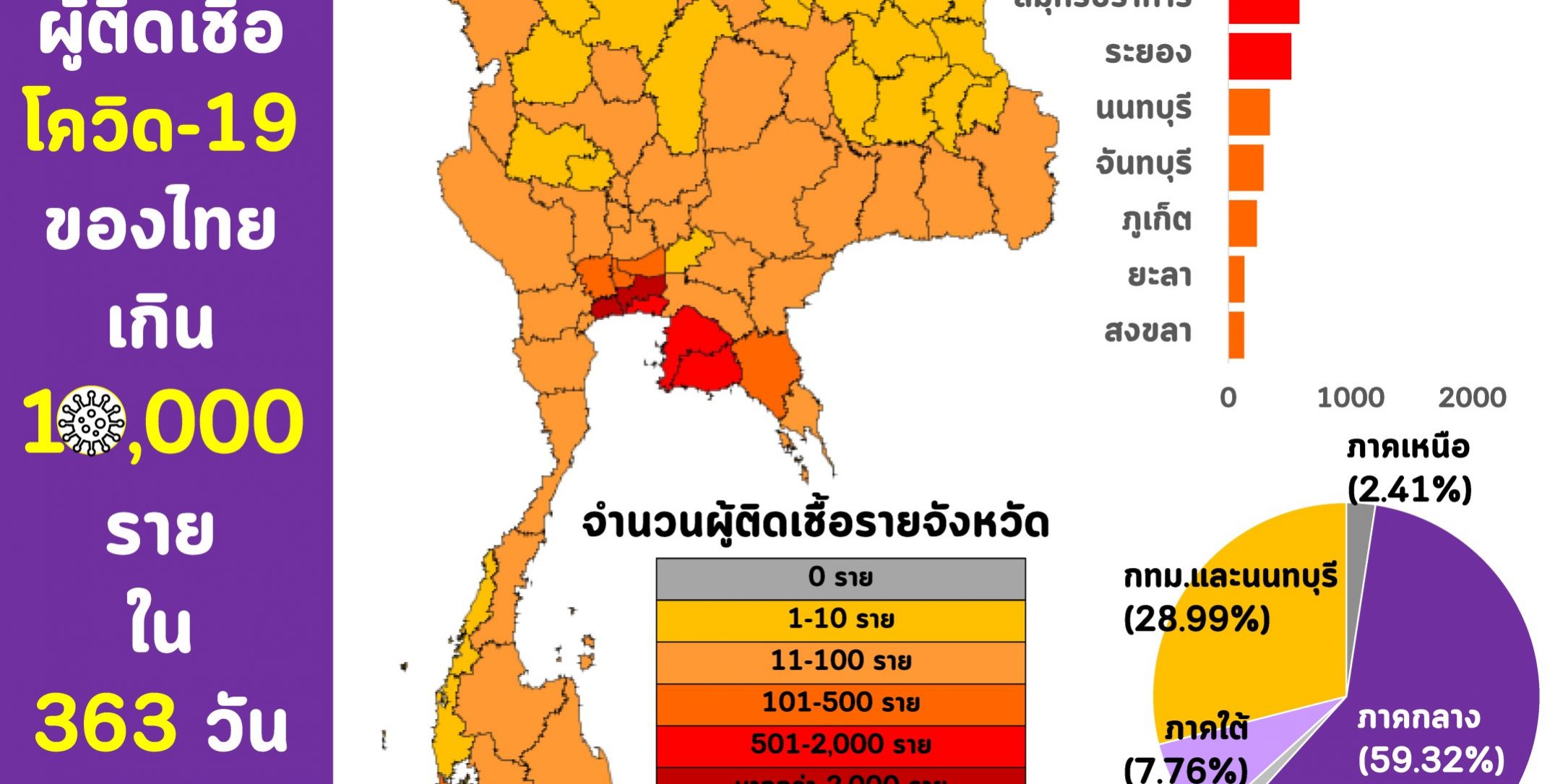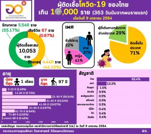 โดยในวันนี้ วันที่ 9 มกราคม 2564 ประเทศไทยมีตัวเลขผู้ติดเชื้อสะสมทะลุ 10,000 ราย (อว.) จึงขอสรุปสถิติสำคัญ ดังนี้