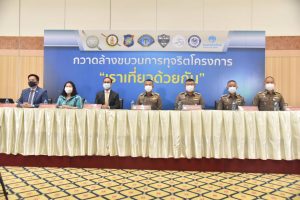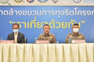 วันที่ 27 ม.ค.64 เวลา 10.00 น. : พล.ต.อ.สุวัฒน์ แจ้งยอดสุข ผบ.ตร. พร้อมด้วย พล.ต.อ.ดำรงศักดิ์ กิตติประภัสร์ รอง ผบ.ตร./ผู้อำนวยการศูนย์ปราบปรามอาชญากรรมทางเทคโนโลยีสารสนเทศ สำนักงานตำรวจแห่งชาติ (ผอ.ศสอส.ตร.),พล.ต.ท.นิทัศน์ ลิ้มศิริพันธ์ ผบช.ทท.,พล.ต.ต.จิรภพ ภูริเดช รอง ผบช.ก.,นายเขมพล อุ้ยตยะกุล เลขานุการรัฐมนตรีว่าการกระทรวงการท่องเที่ยวและกีฬา,น.ส.สภัทร์พร ธรรมาภรณ์พิลาศ รองผู้อำนวยการสำนักงานเศรษฐกิจการคลัง และผู้แทนธนาคารกรุงไทย ร่วมกันแถลงข่าวจับกุม “ขบวนการทุจริต โครงการเราเที่ยวกัน” ผู้ต้องหา 50 ราย