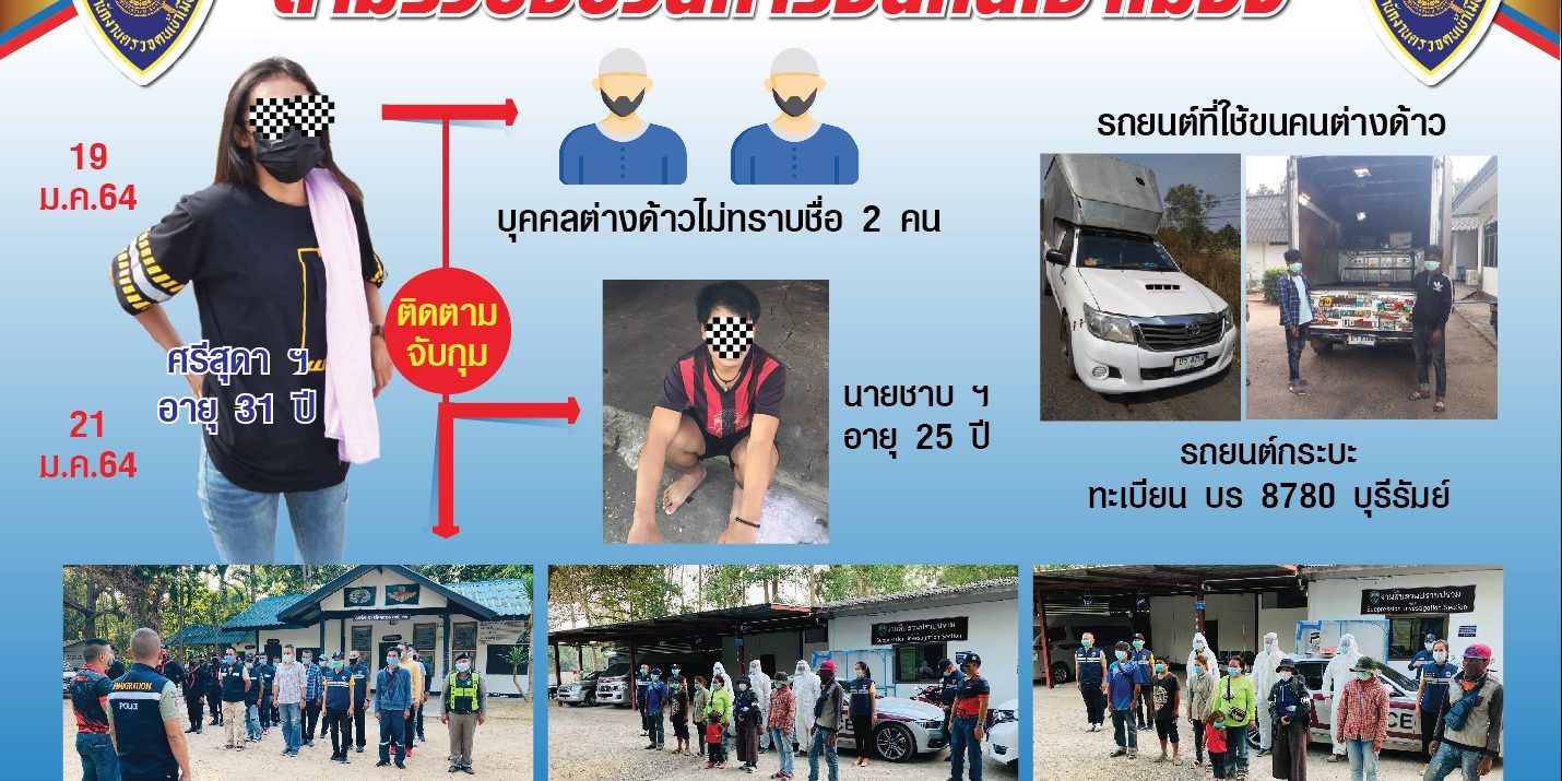 โดยตม.จ.บุรีรัมย์ ร่วมกับหน่วยงานที่เกี่ยวข้องได้ทำการจับกุมตัว น.ส.ศรีสุดาฯ อายุ 30 ปี สัญชาติไทย พร้อมของกลางเป็นรถยนต์กระบะหมายทะเบียนบุรีรัมย์ ในข้อหา “นำหรือพาคนต่างด้าวเข้ามาในราชอาณาจักรหรือกระทำด้วยประการใดๆ อันเป็นการอุปการะหรือช่วยเหลือ หรือให้ความสะดวกแก่คนต่างด้าวเข้ามาในราชอาณาจักรโดยฝ่าฝืนกฎหมายฯ” พร้อมด้วยชาวกัมพูชา 2 คนในข้อหา “เป็นบุคคลต่างด้าว เข้ามาและอยู่ในราชอาณาจักรโดยไม่ได้รับอนุญาต” ซึ่งนั่งโดยสารมาในรถยนต์คันดังกล่าว เจ้าหน้าที่ชุดจับกุมสกัดจับได้บริเวณถนนในหมู่บ้านโคกกัด ม.12 ต.โคกม่วง อ.ปะคำ จ.บุรีรัมย์ จึงควบคุมตัวนำส่ง พงส.สภ.ปะคำ ดำเนินคดี