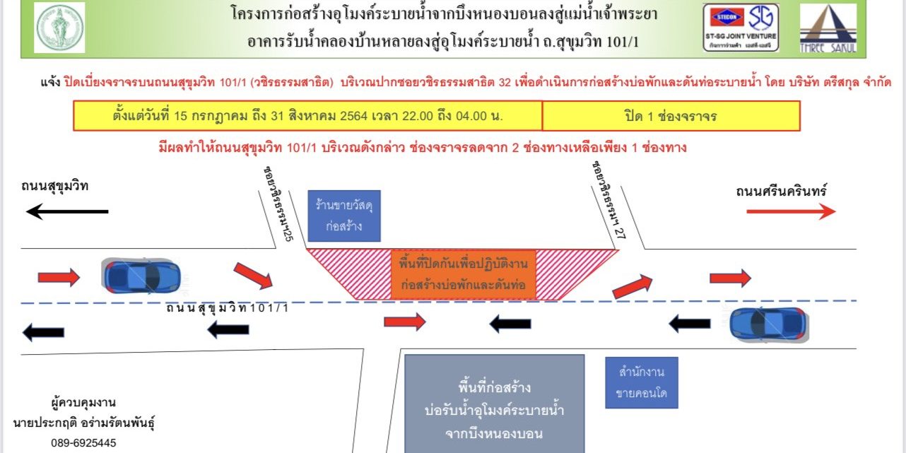 วงษ์รัฐพิทักษ์ ผบก.จร. ขอประชาสัมพันธ์ข่าวสารด้านการจราจร “แนะนำแจ้งเลี่ยงเส้นทางกรณีปิดเบี่ยงการจราจร (ชั่วคราว) บนถนนสุขุมวิท 101/1 (วชิรธรรมสาธิต) ฝั่งขาออก บริเวณซอยวชิรธรรมสาธิต 25 ถึงซอยวชิรธรรมสาธิต 27 เนื่องจากกรุงเทพมหานคร จะดำเนินโครงการก่อสร้างอุโมงค์ระบายน้ำจากบึงหนองบอนลงสู่แม่น้ำเจ้าพระยา และอาคารรับน้ำคลองบ้านหลายลงสู่อุโมงค์ระบายน้ำ บริเวณปากซอยวชิรธรรมสาธิต 32 ซึ่งมีความจำเป็นต้องปิดเบี่ยงการจราจร บนถนนสุขุมวิท 101/1 (วชิรธรรมสาธิต) ฝั่งขาออก บริเวณซอย