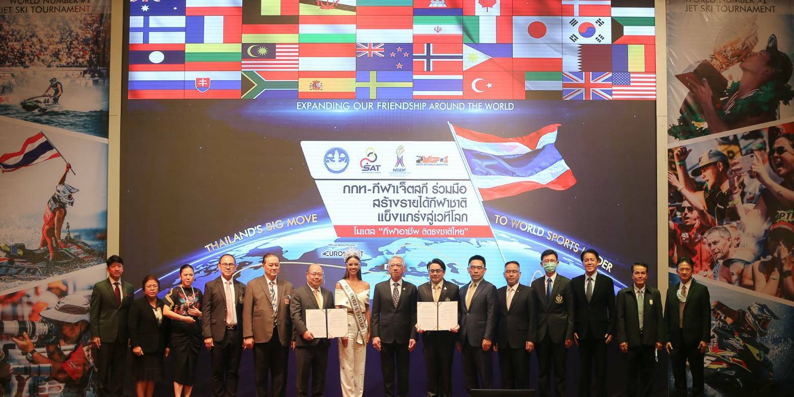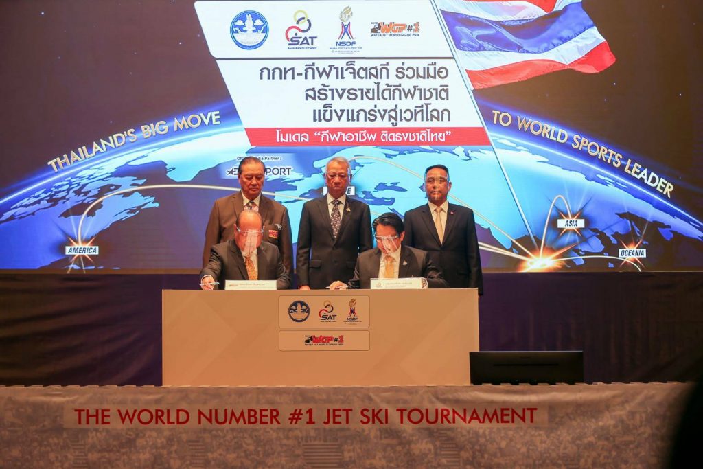 จากการที่การกีฬาแห่งประเทศไทย ได้ทำบันทึกความร่วมมือ (MOU) กับ บริษัท เอเชี่ยนมัลติสปอร์ต แอนด์ เอ็น-เตอร์เทนเม้นท์ จำกัด เจ้าของลิขสิทธิ์ทัวร์นาเม้นท์เจ็ตสกีเวิลด์คัพและเวิลด์ซีรี่ส์ โดยมี ฯพณฯพิพัฒน์ รัชกิจประการ รัฐมนตรีว่าการกระทรวงการท่องเที่ยวและกีฬา เป็นประธานในพิธี ร่วมด้วย นายปริเขต สืบสหการ เจ้าของลิขสิทธิ์การจัดการแข่งขันเจ็ตสกีอาชีพ WGP#1 ลงนาม (MOU) การทำความตกลงการให้การช่วยเหลือ การส่งเสริมหรือการสนับสนุน กีฬาเจ็ตสกีอาชีพของไทยภายใต้ชื่อโครงการ “กีฬาอาชีพ ติดธงชาติไทย” โดยมี ดร.ก้องศักด ยอดมณี ผู้ว่าการการกีฬาแห่งประเทศไทย นายเขมพล อุ้ยตยะกุล เลขานุการรัฐมนตรีว่าการกระทรวงการท่องเที่ยวและกีฬา นายขจร เจียรวนนท์ นักบริหารธุรกิจ และนักบริหารกีฬาระดับชาติ นายณัฐวุฒิ เรืองเวส กรรมการการกีฬาแห่งประเทศไทยฯ นายทนุเกียรติ จันทร์ชุม ผู้อำนวยการฝ่ายกีฬาอาชีพ การกีฬาแห่งประเทศไทย พลตำรวจเอก เดชณรงค์ สุทธิชาญบัญชา รองประธานคณะกรรมาธิการการกีฬา วุฒิสภา นางสาวฐาปนีย์ เกียรติไพบูลย์ รองผู้ว่าการด้านสินค้าและธุรกิจท่องเที่ยว นางจริยา ชุมพงศ์ ผู้เชี่ยวชาญเฉพาะด้านนโยบายและยุทธศาสตร์สำนักนโยบายและแผน สำนักงานปลัดกระทรวงมหาดไทย นายภเชศ จารุมนต์ หัวหน้าศูนย์ให้คำปรึกษาด้านทรัพย์สินทางปัญญาและนวัตกรรม (IP IDE Center) นักวิชาการพาณิชย์ชำนาญการ นายสนิท วรปัญญา นายกสมาคมกีฬาเจ็ตสกีแห่งประเทศไทยฯ ร่วมเป็นเกียรติในงาน ณ ห้องประชุมชั้น 25 อาคารเฉลิมพระเกียรติ 7 รอบ พระชนมพรรษา การกีฬาแห่งประเทศไทย