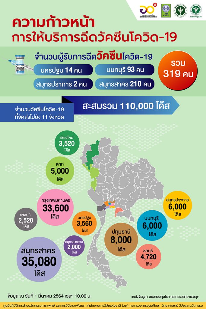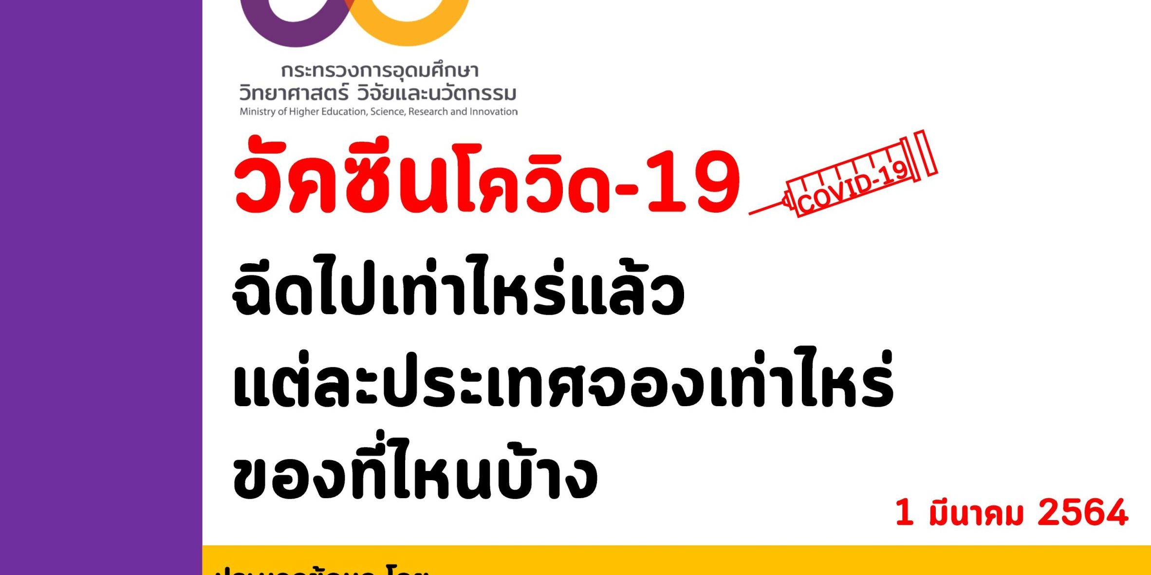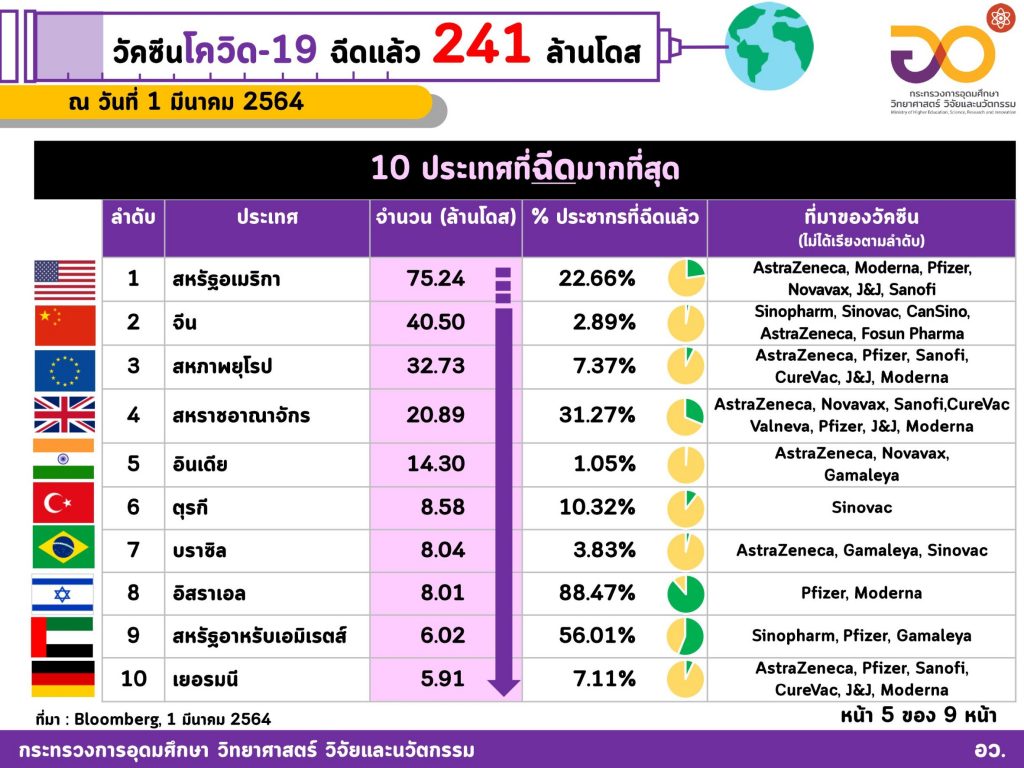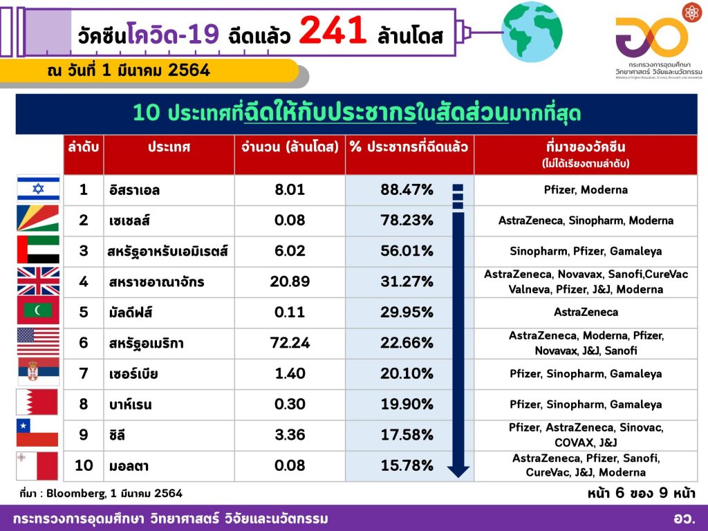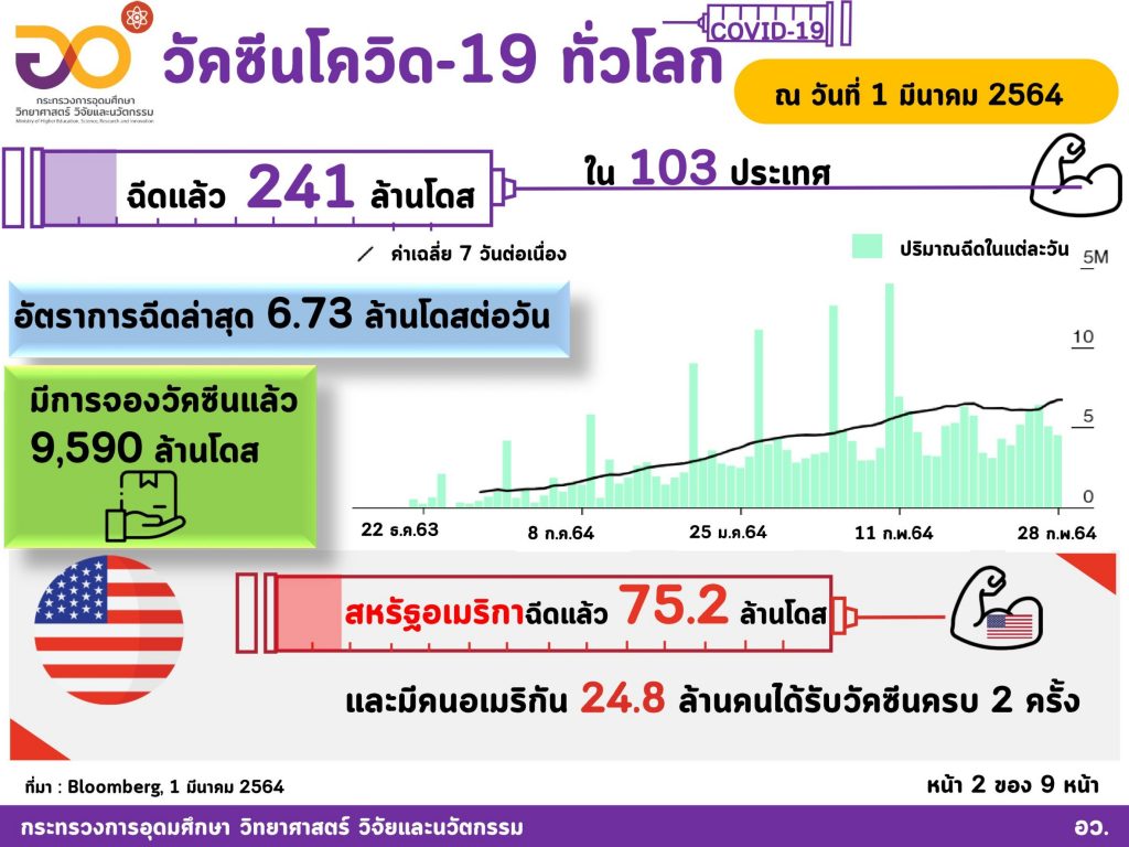 วันที่ 1 มีนาคม 2564 : ศาสตราจารย์ ดร.นายแพทย์สิริฤกษ์ ทรงศิวิไล ปลัดกระทรวงการอุดมศึกษา วิทยาศาสตร์ วิจัยและนวัตกรรม (อว.) เปิดเผยว่า “ล่าสุดมีการฉีดวัคซีนโควิด-19 ทั่วโลกแล้ว 241 ล้านโดส ใน 103 ประเทศ โดยขณะนี้อัตราการฉีดล่าสุดรวมกันทั่วโลกที่ 6.73 ล้านโดสต่อวัน และมีแนวโน้มที่เพิ่มขึ้นอย่างต่อเนื่อง เมื่อพิจารณารายประเทศพบว่าอิสราเอล ยังเป็นประเทศที่มีสัดส่วนประชากรได้รับวัคซีนแล้วมากที่สุดถึงเกือบ 90% ในขณะที่สหรัฐอเมริกา มีจำนวนการฉีดวัคซีนสูงที่สุดที่ 75 ล้านโดส โดยมีชาวอเมริกันเกือบ 25 ล้านคนได้รับวัคซีนครบ 2 โดสแล้ว”