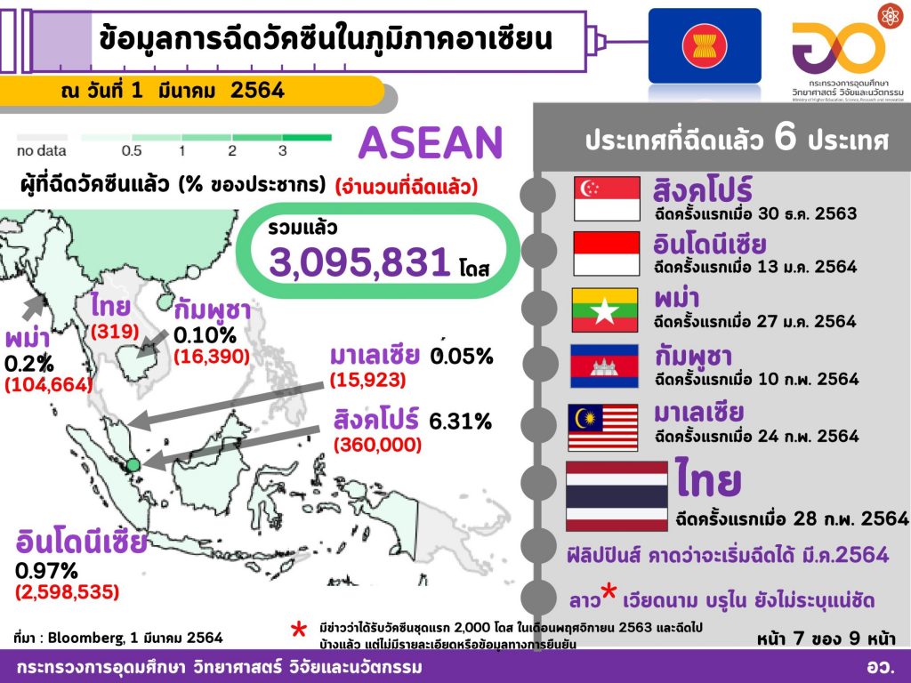 ส่วนในอาเซียนนั้น มี 6 ประเทศที่ได้ฉีดวัคซีนป้องกันโรคโควิด-19 ในประชากรแล้ว โดยมียอดรวมกันที่ประมาณ 3 ล้านโดส สิงคโปร์เป็นประเทศที่มีการฉีดวัคซีนในสัดส่วนประชากรมากที่สุดในภูมิภาค (6.31% ของประชากร) ในขณะที่อินโดนีเซีย ฉีดวัคซีนในจำนวนมากที่สุดที่ 2.6 ล้านโดส สำหรับประเทศไทยได้เริ่มฉีดวัคซีนแล้วเมื่อวันที่ 28 กุมภาพันธ์ 2564 ซึ่งจะมีจำนวนผู้ได้รับวัคซีนเพิ่มขึ้นอย่างรวดเร็ว