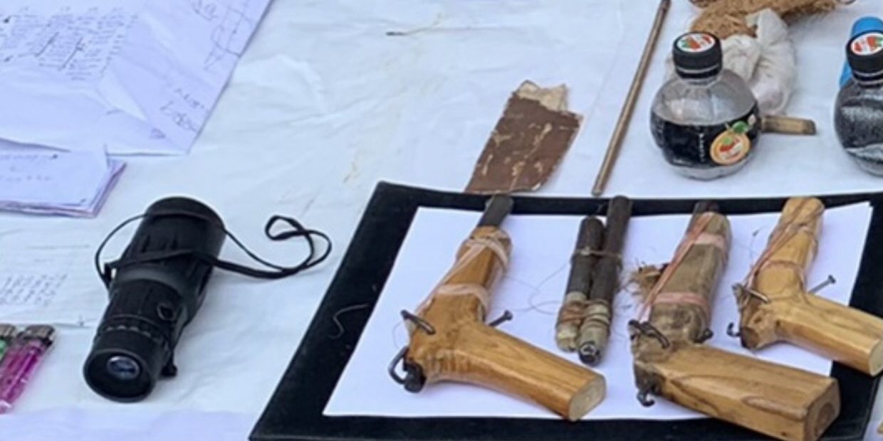 อยู่ภายในกระเป๋าย่ามสีเหลือง พบว่ามีปืนเเก๊ปไทยประดิษฐ์ เเละผงดำลักษณะคล้ายดินปืน บรรจุในขวดพลาสติกกลมเล็ก 2 ขวด