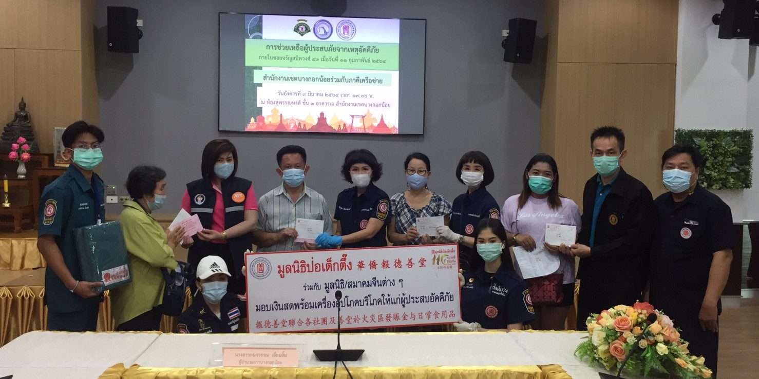 วันนี้ (วันที่ 9 มีนาคม 64) มูลนิธิป่อเต็กตึ๊ง นำโดย นางศิริกุล โอภาสวงศ์ กรรมการและเลขาธิการ พร้อมด้วย นายอรัณย์ โตทวด ผู้จัดการมูลนิธิฯ และนายพินัย ศรีพนาสณฑ์ ผู้จัดการฝ่ายสังคมสงเคราะห์ นำทีมลงพื้นที่ช่วยเหลือผู้ประสบอัคคีภัยร่วมกับมูลนิธิและสมาคมจีนต่างๆ โดยมอบเงินช่วยเหลือคนละ 3,000 บาท พร้อมเครื่องอุปโภคบริโภคที่จำเป็นทั้งรายครอบครัว และรายบุคคล รวมผู้ประสบภัยจำนวน 13 ครอบครัว 20 คน ในการนี้ มูลนิธิไกรสิทธิการกุศล ได้มอบเงินช่วยเหลือเพิ่มเติมคนละ 400 บาท และมูลนิธิพุทธสมาคมปทุมรังษี มอบข้าวสารให้ผู้ประสบภัยเพิ่มเติมอีกคนละ 10 กิโลกรัม รวมงบประมาณเป็นเงิน 91,000 บาท (เก้าหมื่นหนึ่งพันบาทถ้วน) โดยมีนางศิริวรรณ โอภาสวงศ์ อาสาสมัครกิตติมศักดิ์ และนางสาวอธิชา เทศขำ (เมย์-ธิชา) อาสาสมัครศิลปิน ร่วมแจกจ่ายเครื่องอุปโภคบริโภค พร้อมด้วย นางสาวกนกวรรณ เอี่ยมลิ้ม ผู้อำนวยการเขตบางกอกน้อย ร่วมในพิธี ณ สำนักงานเขตบางกอกน้อย กรุงเทพฯ