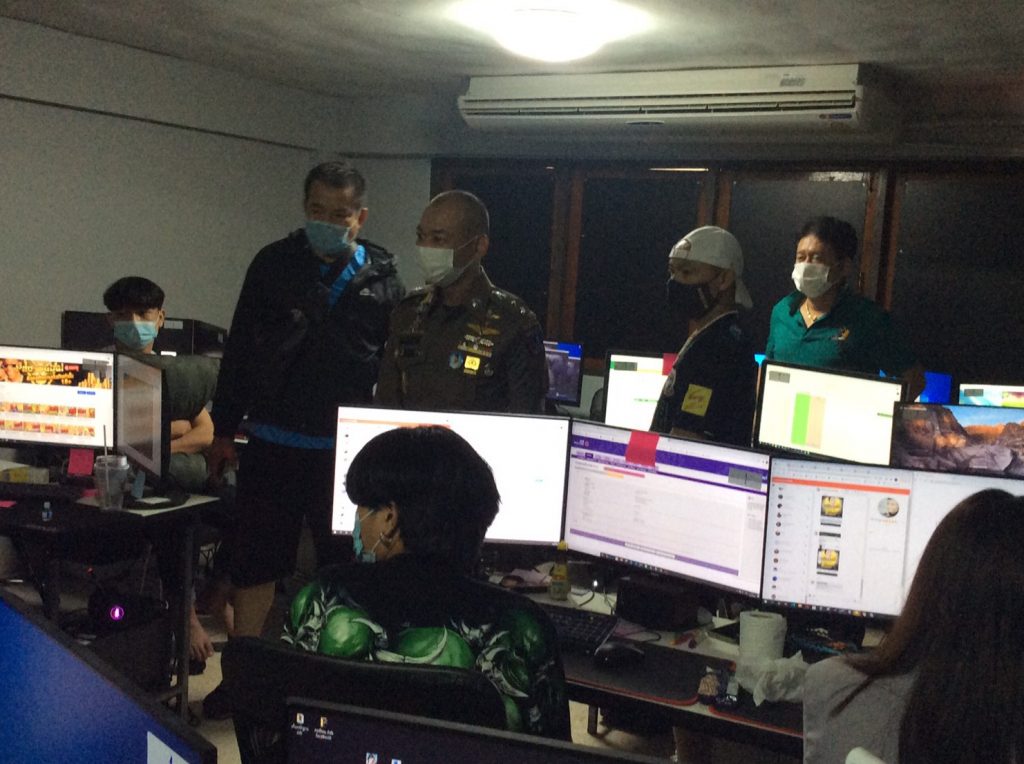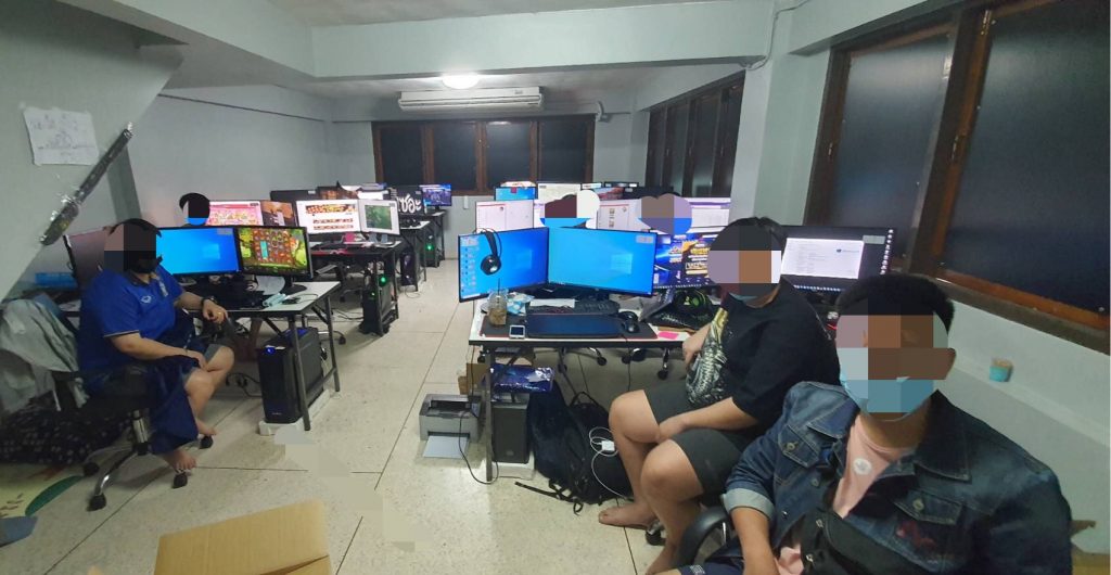 โดยเมื่อวันที่ 10 มีนาคม 2564 เวลาประมาณ 09.00 น. เจ้าหน้าที่ตำรวจ งานสายตรวจ 1 กองกำกับการสายตรวจ กองบังคับการสายตรวจและปฏิบัติการพิเศษ ได้จับกุมตัว นายปพนสรรค์ฯ หรือเบล (สงวนนามสกุล) สัญชาติไทย อายุ 28 ปี ทำหน้าที่ ผู้ดูแล,นายสุวพิชญ์ฯ หรืออาฟ (สงวนนามสกุล) สัญชาติไทย อายุ 25 ปี ทำหน้าที่ เอกสาร-การเงิน,นายอดุลย์ฯ หรือชัย (สงวนนามสกุล) สัญชาติไทย อายุ 17 ปี ทำหน้าที่ แอดมิน,นายตะวันฯ หรืออ๋อง (สงวนนามสกุล) บุคคลไม่มีสถานะทางทะเบียน อายุ 20 ปีทำหน้าที่ การตลาด,นายนาเวียฯ หรือเวีย (สงวนนามสกุล) บุคคลไม่มีสถานะทางทะเบียน อายุ 18 ปี ทำหน้าที่ การตลาด,น.ส.ธนาพรฯ หรือมะนาว (สงวนนามสกุล) สัญชาติไทย อายุ 22 ปี ทำหน้าที่ แอดมิน และ น.ส.ณัฐธิดาฯ หรือฮาย (สงวนนามสกุล) สัญชาติไทย อายุ 26 ปี ทำหน้าที่ การตลาด โดยสามารถตรวจยึดของกลางได้ดังต่อไปนี้ CPU จำนวน 16 เครื่อง,จอมอนิเตอร์ จำนวน 30 เครื่อง,ซิมการ์ดโทรศัพท์ จำนวน 800 ซิมการ์ด,โทรศัพท์มือถือ จำนวน 9 เครื่อง,เมาส์และคีย์บอร์ด จำนวน 16 ตัว และ สมุดบัญชีธนาคารกสิกรไทย จำนวน 3 เล่ม