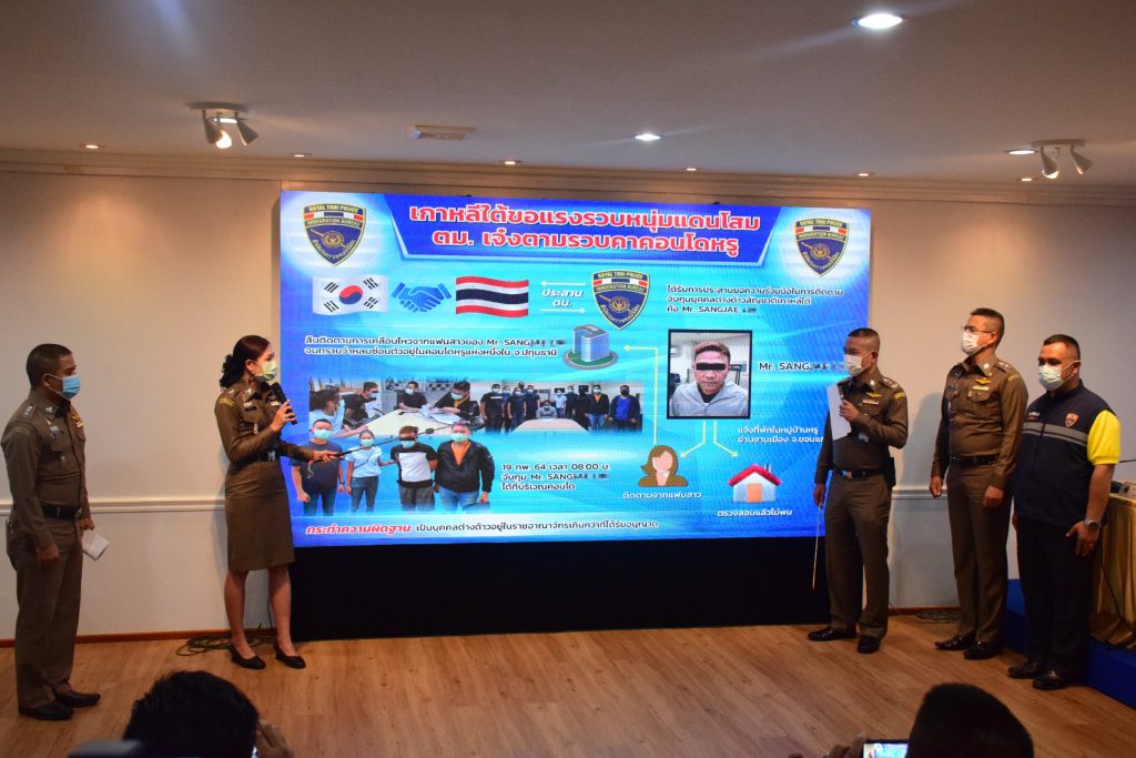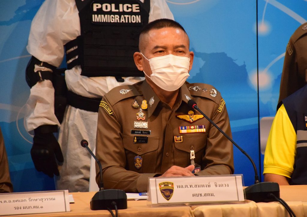 วันที่ 10 มี.ค.64 เวลา 13.30 น. ณ ห้องแถลงข่าวชั้นล่าง สตม.(สวนพลู) แขวงทุ่งมหาเมฆ เขตสาทร กรุงเทพมหานคร : พล.ต.ท.สมพงษ์ ชิงดวง ผบช.สตม. พร้อมด้วย พล.ต.ต.กฤษฎา กาญจนอลงกรณ์ ผบก.ตม.4,พ.ต.อ.เอกมนต์ พรชูเกียรติ,พ.ต.อ.วีรยศ การุณยธร,พ.ต.อ.ปรีชา กองแก้ว รอง ผบก.ตม.4,พ.ต.อ.ภัคพงศ์ สายอุบล รอง ผบก.ตม.1/รองโฆษก สตม.,พ.ต.อ.ยศเอก รักษาสุวรรณ รอง ผบก.ตม.1 และ พ.ต.อ.พิษณุ สิทธิฑูรย์ ผกก.สส.บก.ตม.4 แถลงข่าวผลการจับกุมผู้ต้องหา