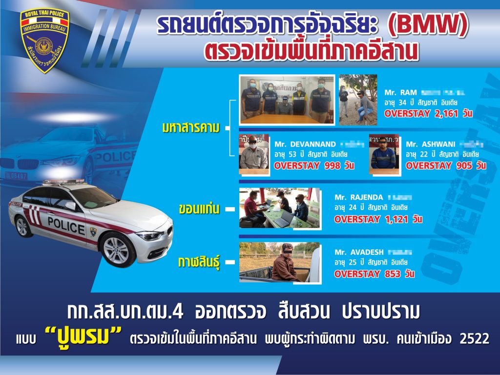 ตามนโยบายของ ผบก.ตม.4 ให้ตรวจสอบบุคคลต่างด้าวที่อยู่และเข้ามาในราชอาณาจักรโดยไม่ได้รับอนุญาตหรือการอนุญาตสิ้นสุดในพื้นที่ บก.ตม.4 กองกำกับการสืบสวนสอบสวนตรวจคนเข้าเมือง 4 จึงนำรถยนต์ตรวจการอัจฉริยะ (BMW) ออกตรวจสอบพื้นที่รับผิดชอบ เมื่อพบบุคคลต่างด้าวต้องสงสัย จึงได้เชิญตัวมาตรวจสอบด้วยระบบสารสนเทศสำนักงานตรวจคนเข้าเมือง (Biometrics) ซึ่งสามารถตรวจพบและจับกุมผู้กระทำความผิดได้ทั้งสิ้น จำนวน 5 ราย ได้แก่