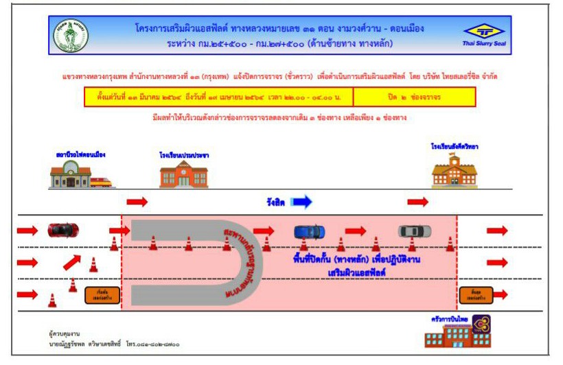 บช.น. ขอประชาสัมพันธ์แนะนำผู้ใช้รถใช้ถนน หากไม่มีความจำเป็น โปรดหลีกเลี่ยงเส้นทางดังกล่าว ในช่วงเวลาทำการปรับปรุงพื้นผิวถนน หากจำเป็นต้องใช้เส้นทางดังกล่าวในช่วงเวลาปฏิบัติงาน โปรดใช้ความระมัดระวัง โดยสามารถนำข้อมูลนี้มาวางแผนการเดินทางเพื่อความสะดวกและปลอดภัยของผู้ขับขี่ที่ใช้เส้นทางดังกล่าว พร้อมทั้ง ขอความร่วมมือพี่น้อง ประชาชนให้ปฏิบัติตามกฎจราจรเพื่อความปลอดภัยในการใช้รถใช้ถนน หากพบเห็นปัญหาจราจรหรืออุบัติเหตุสามารถแจ้งได้ที่ ศูนย์ควบคุมและสั่งการจราจร (บก.02) สายด่วน 1197 หรือแอพลิเคชั่น M-Help me ได้ตลอด 24 ชม.