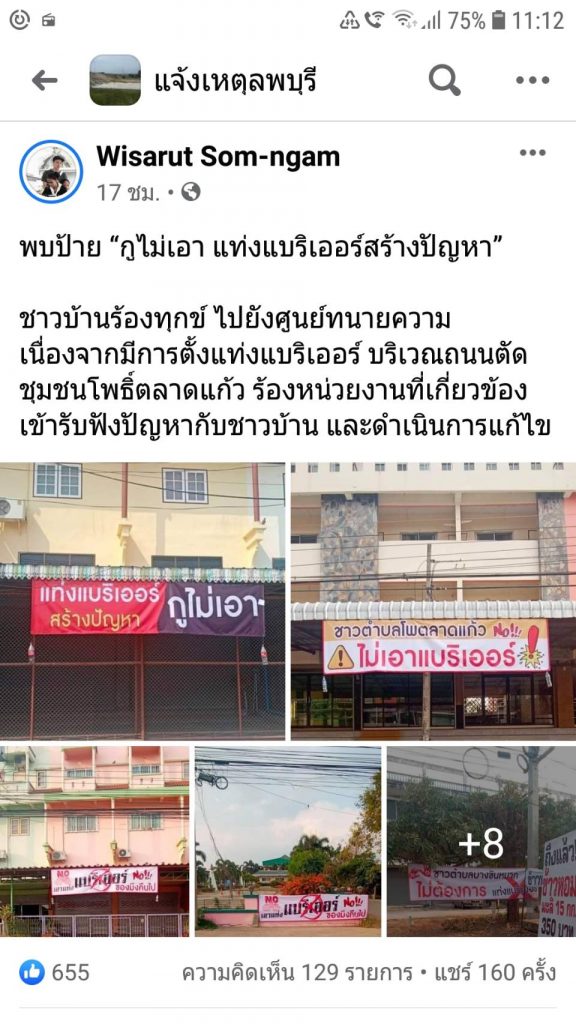 สมาชิกเฟซบุ๊ก wisarut. Som-ngam ได้โพสต์ข้อความตอนหนึ่งว่า ชาวบ้านร้องทุกข์ไปยังศูนย์ทนายความประจำจังหวัดลพบุรี เนื่องจากมีแท่ง แบริเออร์ สร้างปัญหา บริเวณ ถนนตัดชุมชนโพธิ์ตลาดแก้ว อำเภอท่าวุ้ง จังหวัดลพบุรี ร้องหน่วยงานที่เกี่ยวข้องเข้ามารับฟังปัญหากับชาวบ้าน และดำเนินการแก้ไขอย่างเร่งด่วนเพราะประชาชนเดือดร้อนอย่างหนัก