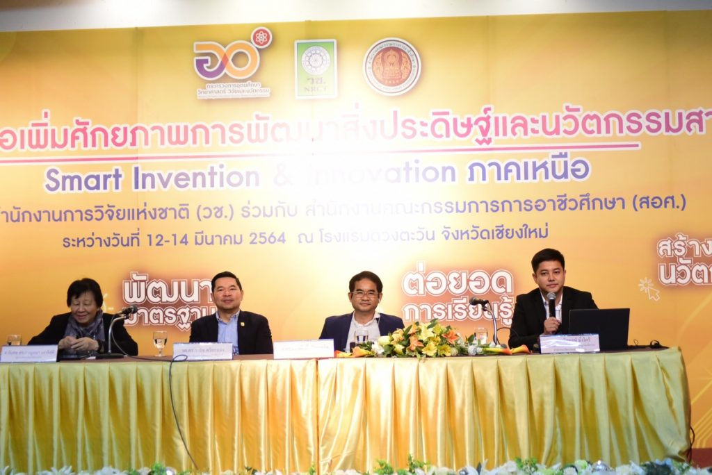 (วช.) และ (สอศ.) จึงได้ร่วมกันวางแผนสร้างกลไกและจัดทำกิจกรรมเพื่อส่งเสริมให้เยาวชนและบุคลากรของสถาบันการศึกษาได้พัฒนาศักยภาพบุคลากรให้มีทักษะและคุณลักษณะที่สอดรับกับการเปลี่ยนแปลงด้านเทคโนโลยีของโลก สามารถสร้างองค์ความรู้และนวัตกรรมที่สร้างผลผลิตและมูลค่าเพิ่มทางเศรษฐกิจให้กับประเทศได้ต่อไป โดยในครั้งนี้ (วช.) ร่วมกับ (สอศ.) ร่วมกันจัดกิจกรรมบ่มเพาะเพื่อเพิ่มศักยภาพการพัฒนาสิ่งประดิษฐ์และนวัตกรรมสายอาชีวศึกษา : Smart Invention & Invention (ภาคเหนือ) ระหว่างวันที่ 15–17 มกราคม 2564 และมีพิธีเปิดในวันที่ 13 มีนาคม 2564 โดย ดร.วิภารัตน์ ดีอ่อง ผู้อำนวยการสำนักงานการวิจัยแห่งชาติ เป็นประธานในพิธีเปิดพร้อมปาฐกถาพิเศษ เรื่อง “การพัฒนาขีดความสามารถในการแข่งขันของประเทศ : Smart Invention & Invention” เวลา 10.30 น. ณ ห้องดวงตะวันแกรนด์บอลรูม โรงแรมดวงตะวัน จังหวัดเชียงใหม่