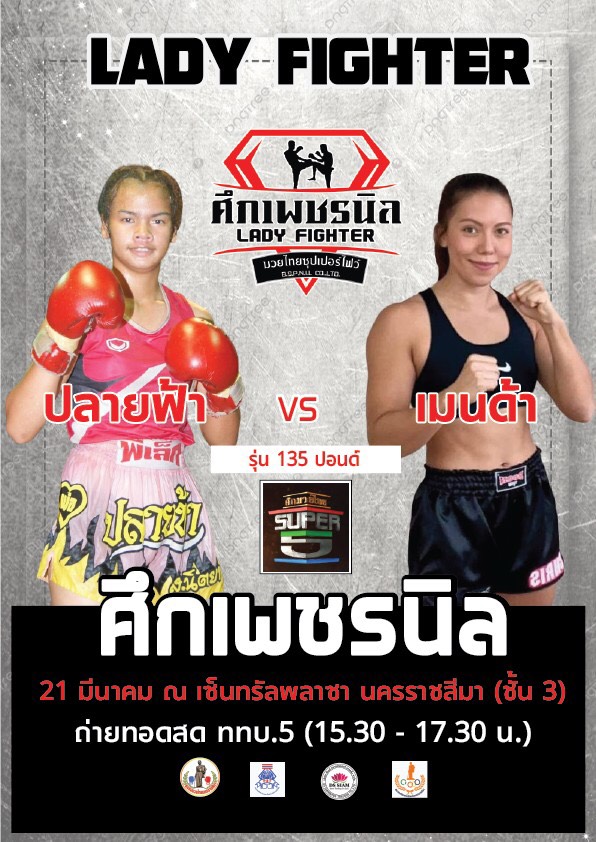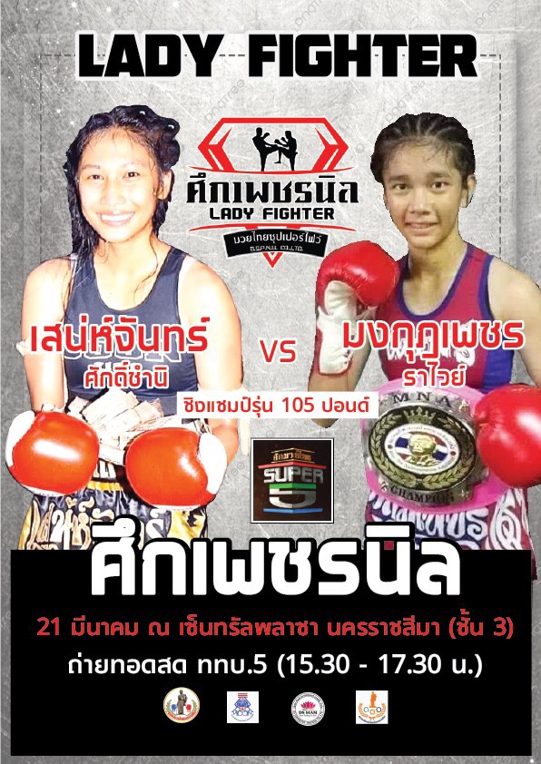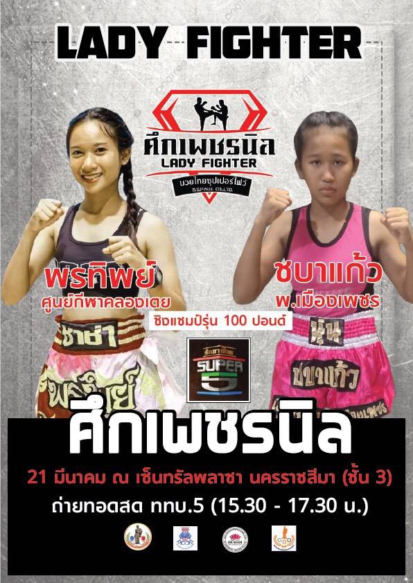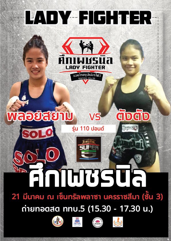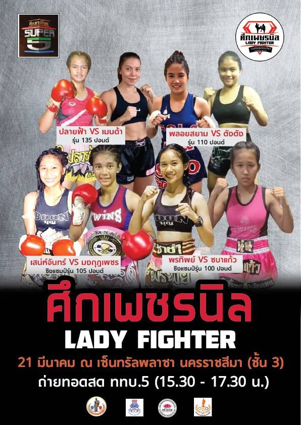 ที่จังหวัดนครราชสีมา ผู้สื่อข่าวรางานว่า พันเอก บุญส่ง พรมนิล ประธานชมรมมวยไทยนครราชสีมาร่วมกับสมาคมกีฬามวยอาชีพแห่งประเทศไทย จัดชิงแชมป์มวยหญิง LADY FIGHT เตรียมระเบิดความมันส์นัดปฐมฤกษ์ กับ “ศึกเพชรนิล” เวทีแห่งหญิงแกร่ง ชมการแข่งขันผ่านการถ่ายทอดสด ช่อง ททบ.5 HD-1 ได้ทุกวันอาทิตย์ เวลา 1530-1730 นัดแรก ศึกชิงแชมป์กีฬามวยหญิงอาชีพแห่ง