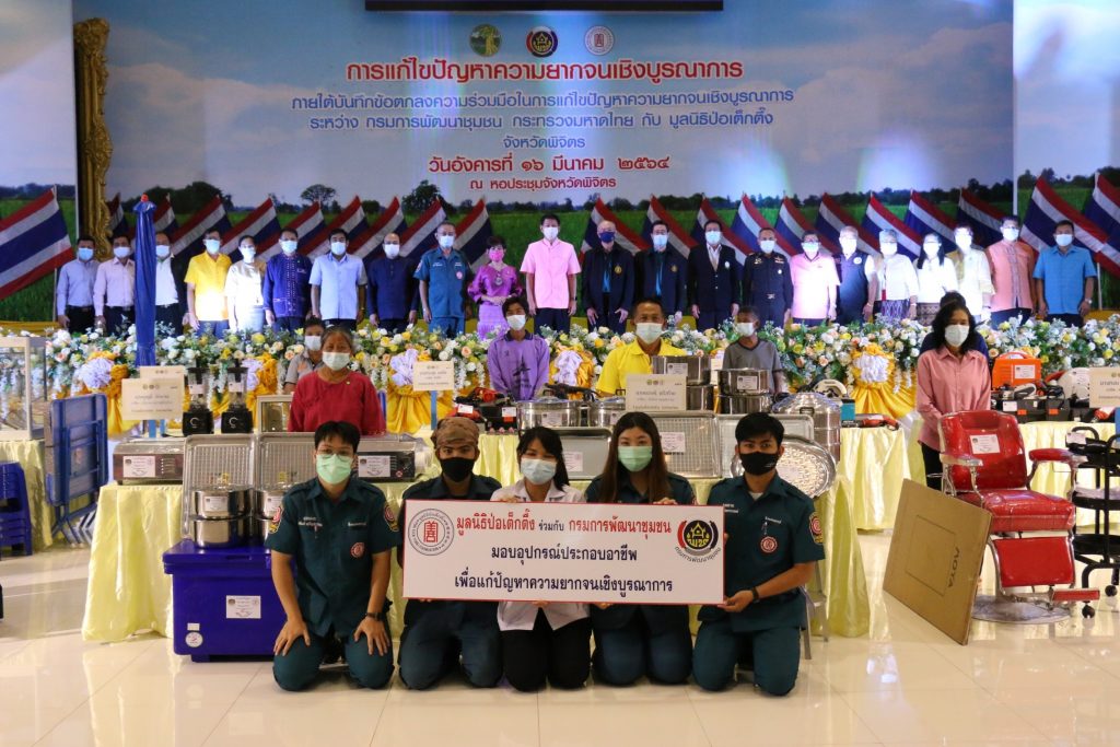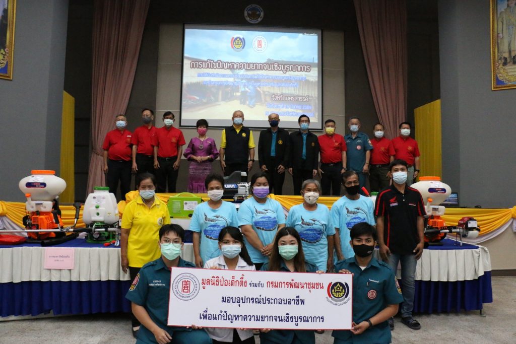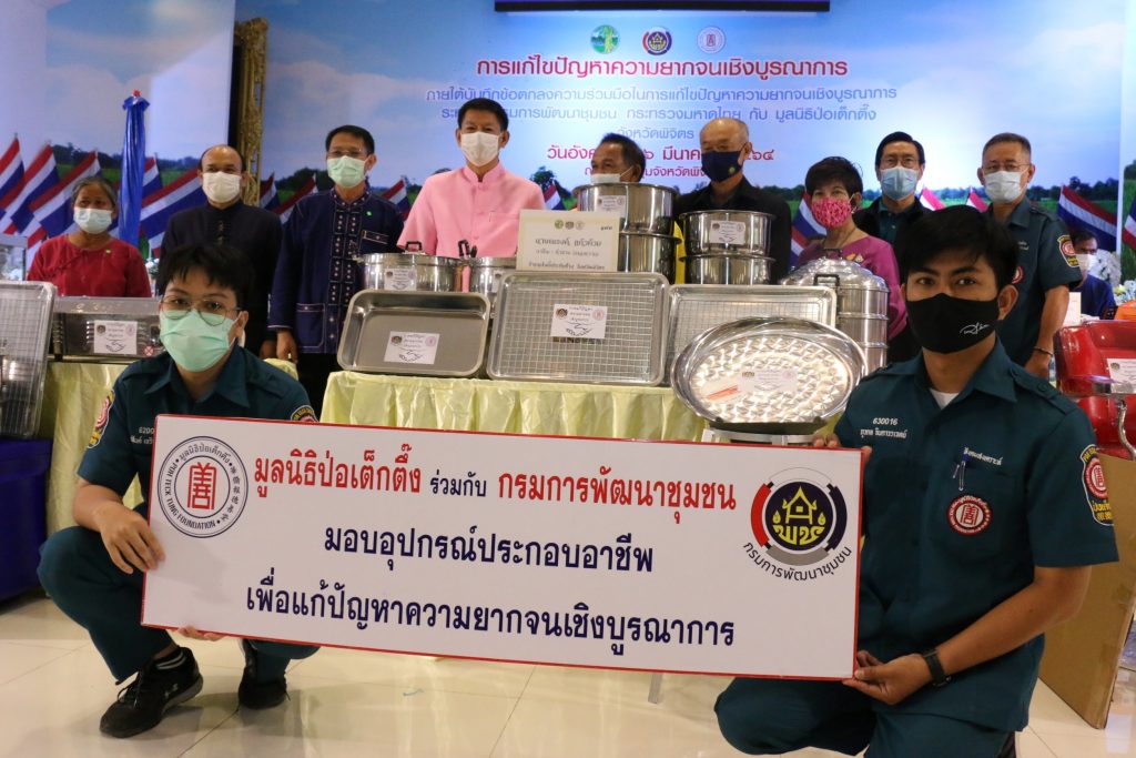 การดำเนินการ “โครงการแก้ไขปัญหาความยากจนเชิงบูรณาการ” มูลนิธิป่อเต็กตึ๊ง โดยฝ่ายสังคมสงเคราะห์ จะจัดทีมลงพื้นที่ร่วมกับกรมการพัฒนาชุมชน กระทรวงมหาดไทย พร้อมให้ความรู้ ทักษะ และมีวัสดุอุปกรณ์ไปประกอบอาชีพเลี้ยงตนเองและครอบครัว โดยมูลนิธิป่อเต็กตึ๊งได้จัดหาอุปกรณ์การประกอบอาชีพให้กับครัวเรือนยากจน เพื่อลดปัญหาความเหลื่อมล้ำในสังคม ตลอดจนสร้างความสุขสู่ชุมชน สังคม และประเทศชาติอย่างยั่งยืน ซึ่งในปี 2562 ที่ผ่านมา มูลนิธิป่อเต็กตึ๊ง ได้พิจารณาครัวเรือนยากจนให้ได้รับวัสดุอุปกรณ์ประกอบอาชีพ จำนวน 98 ครัวเรือน และดำเนินการมอบวัสดุอุปกรณ์แล้วในปี 2563 รวมเป็นมูลค่าทั้งสิ้น จำนวน 1,288,712 บาท (หนึ่งล้านสองแสนแปดหมื่นแปดพันเจ็ดร้อยสิบสองบาทถ้วน)