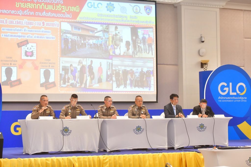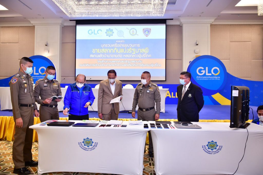 วันที่ 29 มี.ค.64 ที่ สำนักงานสลากกินแบ่งรัฐบาล ถนนสนามบินน้ำ อ.เมือง จ.นนทบุรี : นายลวรณ แสงสนิท ประธานกรรมการสลากกินแบ่งรัฐบาลพร้อมด้วย ผศ.ดร.ธนวรรธน์ ผลวิชัย โฆษกคณะกรรมการสลากกินแบ่งรัฐบาล,พ.ต.อ.บุญส่ง จันทรีศรี ผู้อำนวยการสำนักงานสลากกินแบ่งรัฐบาล,พล.ต.ต.ณัฐศักดิ์ เชาวนาศัย ผบก.ปคบ. และ พ.ต.อ.ชนันนัทธ์ สารถวัลย์แพศย์ รอง ผบก.ปคบ. ร่วมแถลงข่าวผลการจับกุมของ พ.ต.อ.เชษฐ์พันธ์ กิติเจริญศักดิ์ ผกก.1 บก.ปคบ. และพ.ต.ท.ไกรวิศท์ แสนทวีสุข รอง ผกก.1 บก. ปคบ. พร้อมเจ้าหน้าที่ชุดสืบสวน กก.1 บก.ปคบ. ที่ร่วมทำการสืบสวนจับกุมผู้ต้องหาตามหมายจับศาลอาญา ซึ่งได้ร่วมกันโฆษณาหลอกขายสลากกินแบ่งรัฐบาล แบบออนไลน์ แต่ไม่มีสลากกินแบ่งรัฐบาลให้กับผู้ซื้อจริง