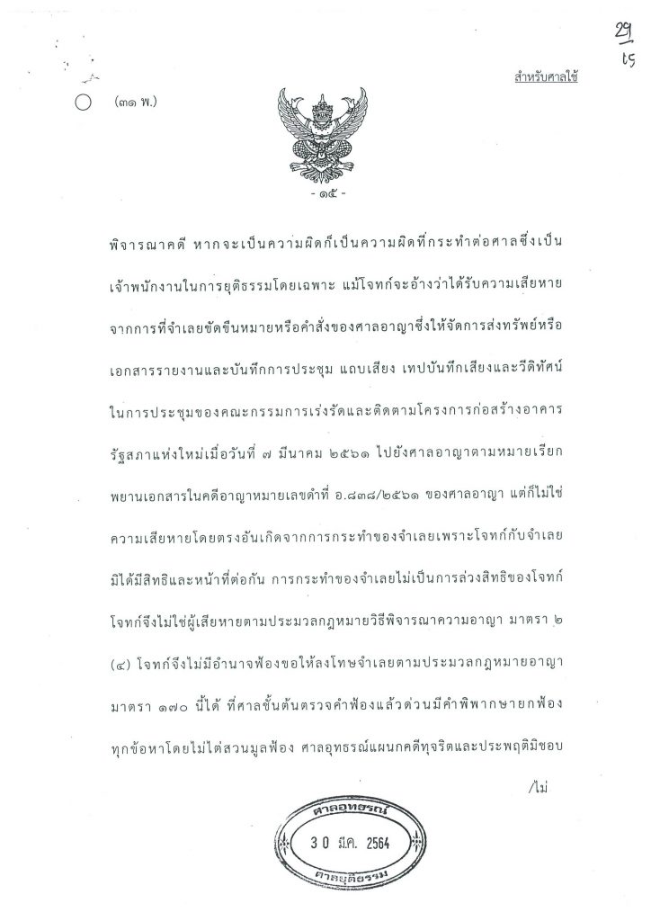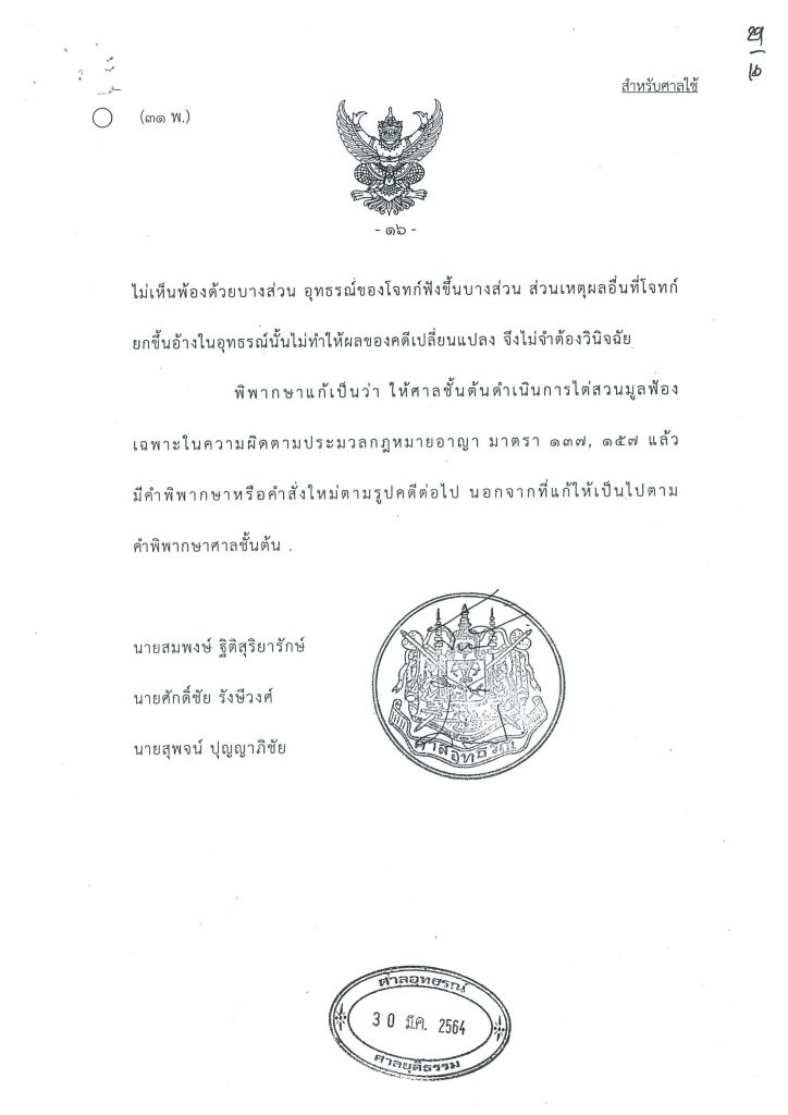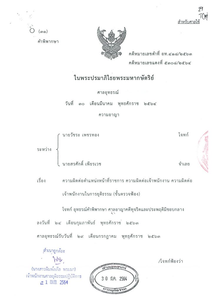 วันที่ 1 เม.ย.64 : นายวัชระ เพชรทอง อดีตส.ส.พรรคประชาธิปัตย์ กล่าวว่า วันนี้ เวลา 10.00 น.ศาลทุจริตและประพฤติมิชอบกลางได้อ่านคำพิพากษาศาลอุทธรณ์ ระหว่างนายวัชระ เพชรทอง โจทก์ นายสรศักดิ์ เพียรเวช อดีตเลขาธิการสภาผู้แทนราษฎร จำเลย เรื่องความผิดต่อตำแหน่งหน้าที่ราชการ ความผิดต่อเจ้าพนักงาน ความผิดต่อเจ้าพนักงานในการยุติธรรม โดยโจทก์อุทธรณ์คำพิพากษาลงวันที่ 24 กุมภาพันธ์ 2564 และอ่านคำพิพากษาในวันนี้ว่า ที่ศาลชั้นต้นตรวจคำฟ้องแล้วด่วนมีคำพิพากษายกฟ้องทุกข้อหาโดยไม่ไต่สวนมูลฟ้อง ศาลอุทธรณ์แผนกคดีทุจริตและประพฤติมิชอบไม่เห็นพ้องด้วยบางส่วน อุทธรณ์ของโจทก์ฟังขึ้นบางส่วน พิพากษาแก้เป็นว่าให้ศาลชั้นต้นดำเนินการไต่สวนมูลฟ้องเฉพาะในความผิดตามประมวลกฎหมายอาญา มาตรา 137,157 แล้วมีคำพิพากษาหรือคำสั่งใหม่ตามรูปคดีต่อไป ศาลนัดพร้อมในวันที่ 5 พฤษภาคม 2564
