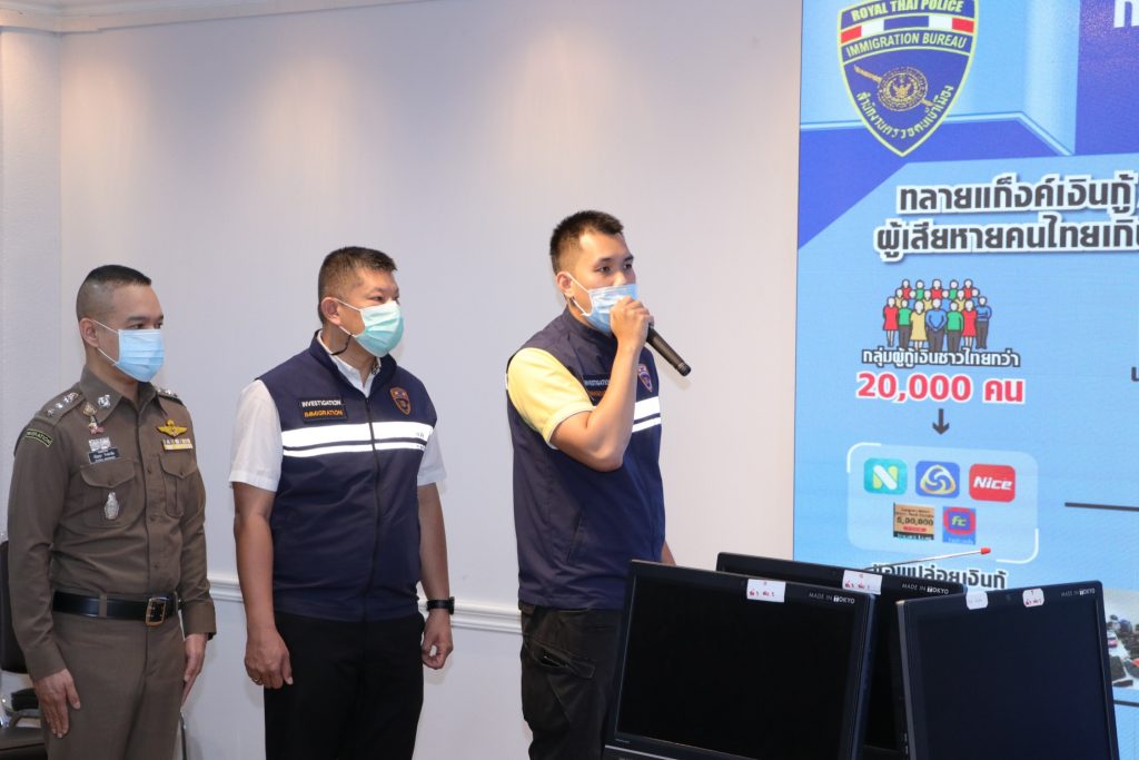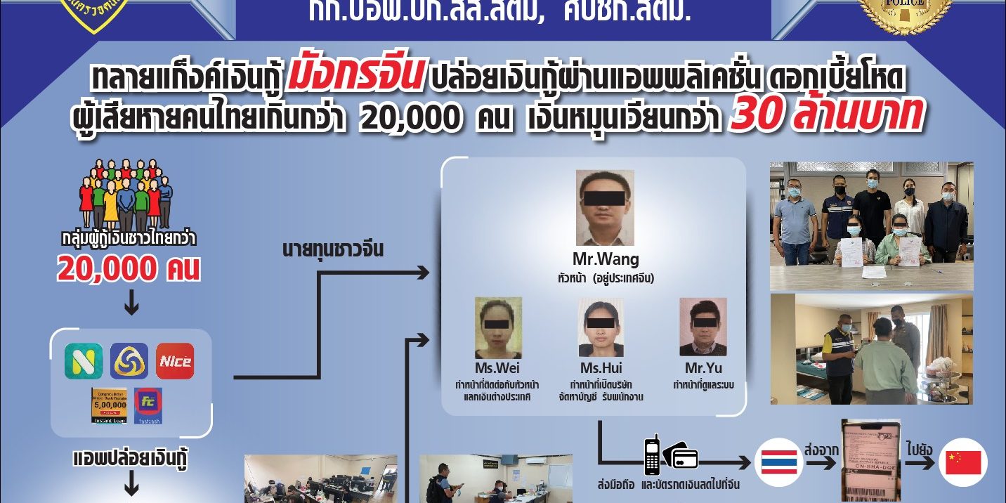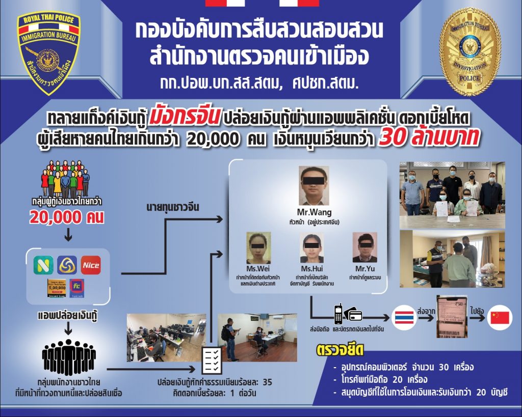โดยทำการจับกุมตัว MS.WEI (เหว่ย) ปกปิดนามสกุล อายุ 34 ปี สัญชาติจีน ตามหมายจับศาลอาญากรุงเทพใต้ ที่ จ.121/2564 ลงวันที่ 19 มีนาคม 2564 ข้อหา ร่วมกันประกอบกิจการปล่อยสินเชื่อส่วนบุคคลโดยผิดกฎหมายและเรียกดอกเบี้ยเกินกว่าอัตราที่กฎหมายกำหนด,MS.HAI (หาย) ปกปิดนามสกุล อายุ 30 ปี สัญชาติจีน ตามหมายจับศาลอาญากรุงเทพใต้ ที่ จ.122/2564 ลงวันที่ 19 มีนาคม 2564 ข้อหา ร่วมกันประกอบกิจการปล่อยสินเชื่อส่วนบุคคลโดยผิดกฎหมายและเรียกดอกเบี้ยเกินกว่าอัตราที่กฎหมายกำหนด,MR.YU (ยู) ปกปิดนามสกุล อายุ 34 ปี สัญชาติจีน ตามหมายจับศาลอาญากรุงเทพใต้ ที่ จ.126/2564 ลงวันที่ 23 มีนาคม 2564 “ข้อหา ร่วมกันประกอบกิจการปล่อยสินเชื่อส่วนบุคคลโดยผิดกฎหมายและเรียกดอกเบี้ยเกินกว่าอัตราที่กฎหมายกำหนด”