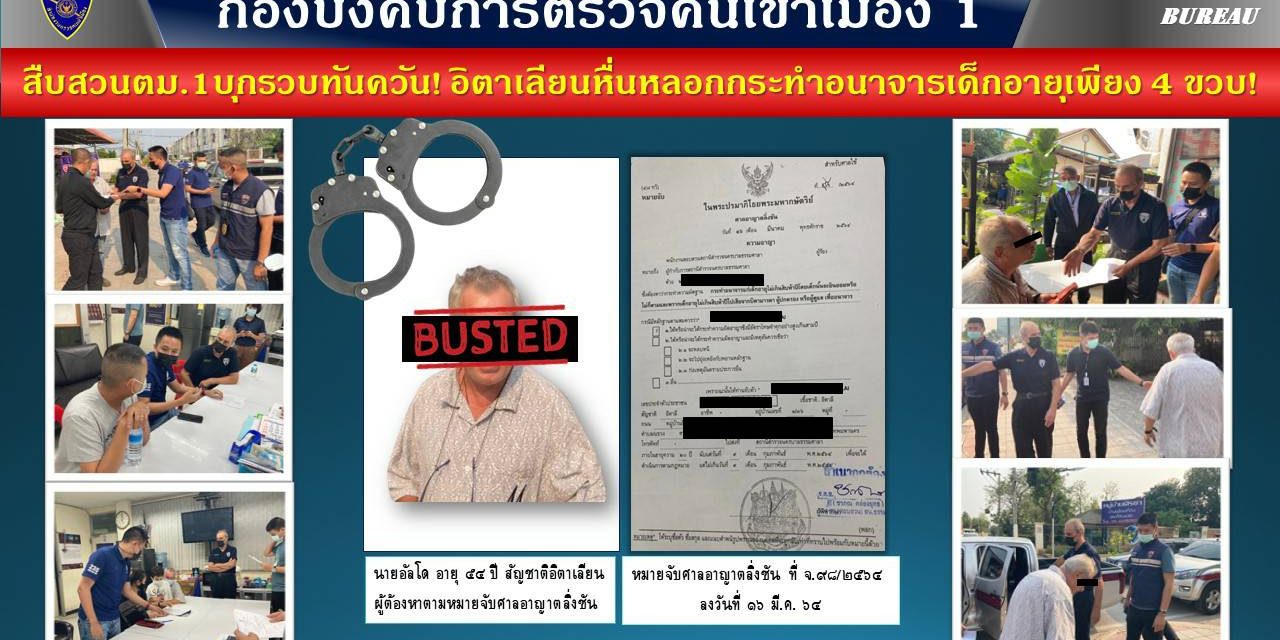 วันที่ 7 เม.ย.64 เวลา 10.30 น.ณ ห้องอเนกประสงค์ ชั้น 1 อาคาร 1 สตม. ซอยสวนพลู แขวงทุ่งมหาเมฆ เขตสาทร กทม. : พล.ต.ท.สมพงษ์ ชิงดวง ผบช.สตม. พร้อมด้วย พล.ต.ต.อาชยน ไกรทอง รอง ผบช.สตม.,พล.ต.ต.ปิติ นิธินนทเศรษฐ์ ผบก.ตม.1,พ.ต.อ.ยศเอก รักษาสุวรรณ รอง ผบก.ตม.1 และ พ.ต.อ.กีรติศักดิ์ ก้องเกียรติศิริ ผกก.สส.บก.ตม.1 พร้อมชุดสืบสวนฯ ร่วมแถลงข่าวการจับกุมคนร้าย ดังนี้ คือนายอัลโด (Aldo) อายุ 54 ปี สัญชาติอิตาเลียน ได้ออกอุบายชักชวน ด.ญ.เอฯ อายุ 4 ปี สัญชาติอเมริกัน ซึ่งเป็นเพื่อนของ ด.ช.แอลฯ บุตรชายของตน ไปรับประทานอาหารที่ร้านอาหารแห่งหนึ่งย่านศาลาธรรมสพน์ เขตทวีวัฒนา กรุงเทพมหานคร