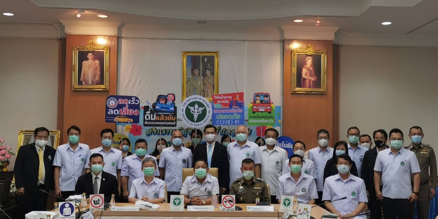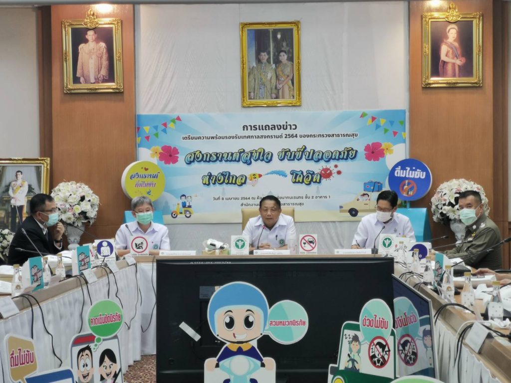 วันที่ 8 เมษายน 2564 เวลา 13.30 น.: นายแพทย์เกียรติภูมิ วงศ์รจิต ปลัดกระทรวงสาธารณสุข พร้อมด้วย นายแพทย์โอภาส การย์กวินพงศ์ อธิบดีกรมควบคุมโรค,นายแพทย์ธเรศ กรัษนัยรวิวงค์ อธิบดีกรมสนับสนุนบริการสุขภาพ,พล.ต.ต.ปิยะ ต๊ะวิชัย รองผู้บัญชาการตำรวจนครบาล สำนักงานตำรวจแห่งชาติ,นายยงยุทธ นาคแดง รองอธิบดีกรมการขนส่งทางบก และดร.นพ.ไพโรจน์ เสาน่วม ผู้ช่วยผู้จัดการกองทุนสนับสนุนการสร้างเสริมสุขภาพ ร่วมแถลงข่าวการเตรียมการรองรับเทศกาลสงกรานต์ 2564 กระทรวงสาธารณสุข “สงกรานต์สุขใจ ขับขี่ปลอดภัย ห่างไกลโควิด” ณ กระทรวงสาธารณสุข จ.นนทบุรี