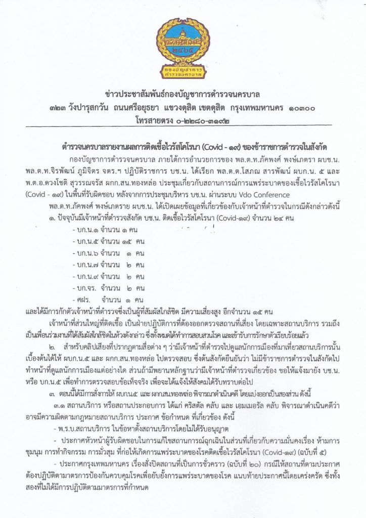 4.บช.น.ได้ปฏิบัติตามประกาศ กรุงเทพมหานคร รวมถึงกฎหมายอื่นๆ ที่เกี่ยวข้อง ในเรื่องการเปิดสถานบริการ หรือ สถานที่เสี่ยงต่อการแพร่ระบาดของเชื้อไวรัสโคโรนา (Covid-19) มาอย่างต่อเนื่อง โดยมีการจัดชุดตรวจ ทั้งของตำรวจเอง และชุดตรวจร่วมกับทางสำนักงานเขต ซึ่งหลังจากที่กรุงเทพมหานครได้ออกประกาศ เรื่องสั่งปิดสถานที่เป็นการชั่วคราว (ฉบับที่ 20) ให้สถานบริการเปิดได้ถึงเวลา 23.00 น. เจ้าหน้าที่ตำรวจก็ได้ออกประชาสัมพันธ์ให้ผู้ประกอบการปฏิบัติตามประกาศดังกล่าว รวมถึงมาตรการแนบท้ายประกาศที่ให้สถานที่แต่ละประเภทดำเนินการเพื่อเป็นการป้องกันการแพร่ระบาดของเชื้อไวรัสโคโรนา (Covid-19) หากพบว่าสถานที่ใดทำไม่ถูกต้องครบถ้วน ก็จะตักเตือน แต่ถ้าได้มีการตักเตือนให้แก้ไขแล้วยังไม่ปฏิบัติตาม ก็จะพิจารณาดำเนินคดีตามกฎหมาย