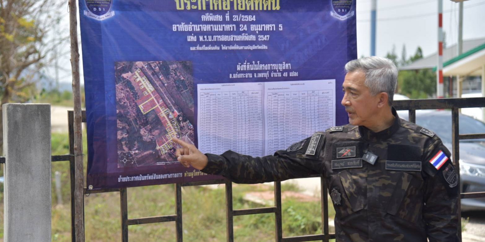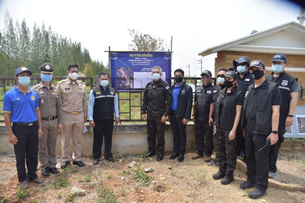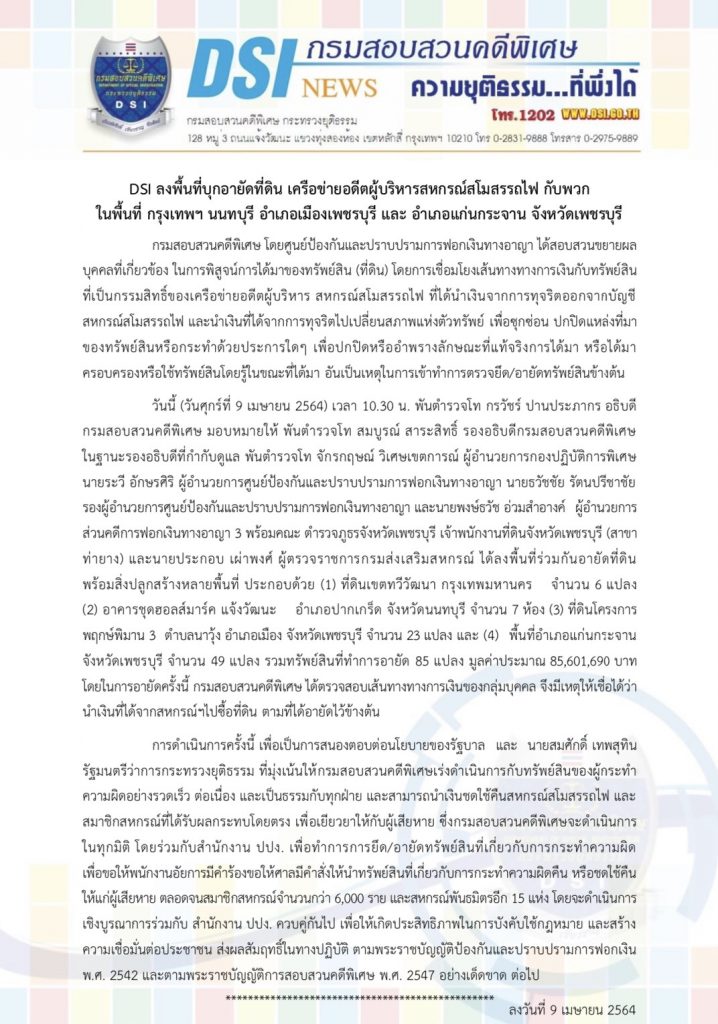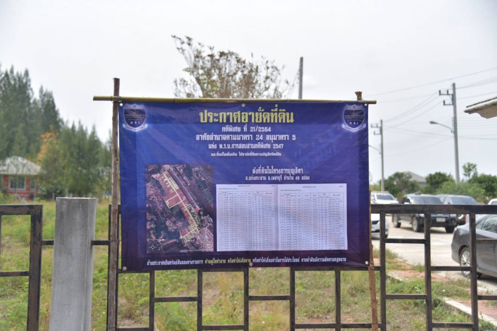 โดยในวันนี้ วันศุกร์ที่ 9 เมษายน 2564 เวลา 10.30 น. พันตำรวจโท กรวัชร์ ปานประภากร อธิบดีกรมสอบสวนคดีพิเศษ มอบหมายให้ พันตำรวจโท สมบูรณ์ สาระสิทธิ์ รองอธิบดีกรมสอบสวนคดีพิเศษ ในฐานะรองอธิบดีที่กำกับดูแล,พันตำรวจโท จักรกฤษณ์ วิเศษเขตการณ์ ผู้อำนวยการกองปฏิบัติการพิเศษ,นายระวี อักษรศิริ ผู้อำนวยการศูนย์ป้องกันและปราบปรามการฟอกเงินทางอาญา,นายธวัชชัย รัตนปรีชาชัย รองผู้อำนวยการศูนย์ป้องกันและปราบปรามการฟอกเงินทางอาญา และนายพงษ์ธวัช อ่วมสำอางค์ ผู้อำนวยการส่วนคดีการฟอกเงินทางอาญา 3 พร้อมคณะ ตำรวจภูธรจังหวัดเพชรบุรี เจ้าพนักงานที่ดินจังหวัดเพชรบุรี (สาขาท่ายาง) และนายประกอบ เผ่าพงศ์ ผู้ตรวจราชการกรมส่งเสริมสหกรณ์ ได้ลงพื้นที่ร่วมกันอายัดที่ดิน