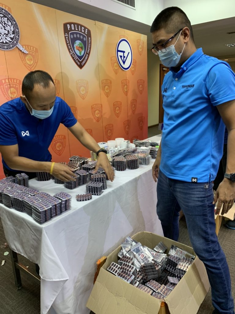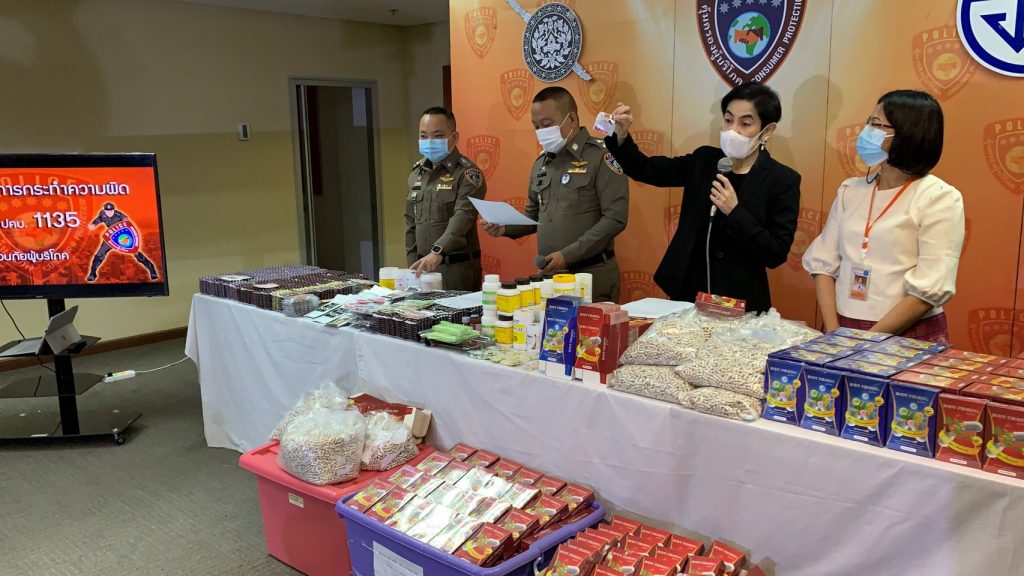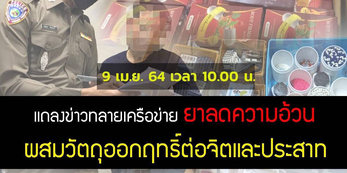 วันที่ 9 เม.ย.64 เวลา 10.00 น . ที่กองบังคับการปราบปรามการกระทำความผิดเกี่ยวกับการคุ้มครองผู้บริโภค (บก.ปคบ.) : พล.ต.ต.ณัฐศักดิ์ เชาวนาศัย ผบก.ปคบ. พร้อมด้วย ภญ.สุภัทรา บุญเสริม รองเลขาธิการคณะกรรมการอาหารและยา (อย.) ร่วมแถลงผลการทลายเครือข่ายจำหน่ายผลิตภัณฑ์ควบคุมน้ำหนักยี่ห้อ BODY FIRMING by nikki ซึ่งตรวจพบสารไซบูทรามีน กว่า 40,000 แคปซูล และทลายเครือข่ายจำหน่ายยาชุดที่ไม่มีทะเบียนประเภทควบคุมน้ำหนักผ่านเพจเฟซบุ๊กและแพลตฟอร์มขายสินค้าออนไลน์