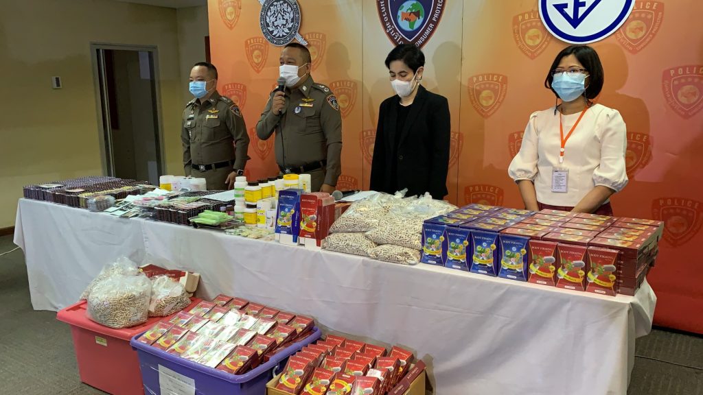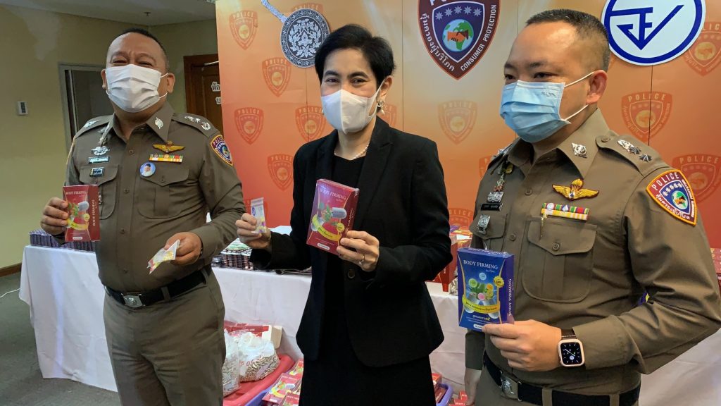 พล.ต.ต.ณัฐศักดิ์ฯ กล่าวว่า สืบเนื่องมาจากเมื่อวันที่ 8 เม.ย.64 ตำรวจ (ปคบ.) ร่วมกับ (อย.) บุกจับผู้ต้องหา 8 คน 10 หมายจับ ในเขตพื้นที่กรุงเทพมหานคร และ สมุทรปราการ พร้อมตรวจยึดผลิตภัณฑ์ควบคุมน้ำหนักยี่ห้อดังกล่าว โดยกลุ่มผู้ต้องหาจะโพสต์ขายสินค้าผ่านเฟซบุ๊ก “Nasachon Limprasert” ขายสินค้าอาหารเสริมลดน้ำหนัก BODY FIRMING by nikki อ้างสรรพคุณ กระชับ พุงยุบ ลดทุกสัดส่วนยกเว้น หน้าอก เห็นผลจริงเชิญทดสอบผลใน 7 วัน,เฟซบุ๊ก “Thanachod Black จำหน่ายวิตามินลดน้ำหนักจากคลินิคปลอดภัย 100 % ปลีก-ส่ง จัดส่งทุกวัน” และ เฟชบุ๊ก “ยาลดน้ำหนักคลินิกหมอโชคชัยแท้ 100%” ซึ่งเฟซบุ๊กเหล่านี้มีการขายยาโดยไม่ใด้รับอนุญาต