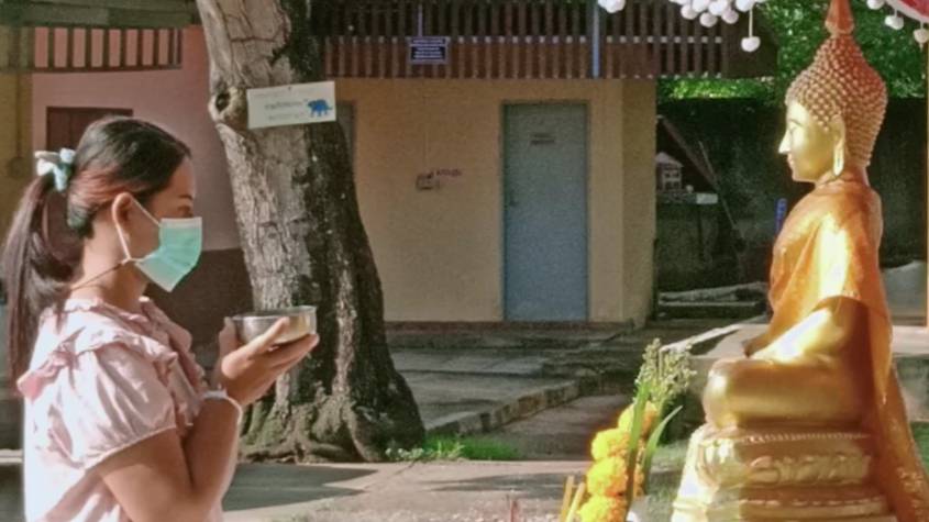 จ.ปราจีนบุรีพุทธศาสนิกชนจำนวนหนึ่งมาทำบุญที่วัดในวันสงกรานต์ตามปกติ น้อยกว่าทุกปีที่ผ่านมาเนื่องจากสถานการณ์การแพร่ระบาดโรคโควิด-19 อย่างต่อเนื่องทำให้ประชาชนทุกพื้นที่ป้องกันตัวอย่างอย่างเต็มที่ การมาทำบุญในวันนี้ทุกคนสวมใส่หน้ากากอนามัยออกจากบ้าน ทางวัดจัดให้มีการวัดอุณหภูมิก่อนเข้าร่วมทำบุญในศาลาการเปรียญ และเจลล้างมือมาไว้บริการให้กับญาติโยมที่หน้าทางเข้าศาลาการเปรียญ ญาติโยมที่มาวัดนั่งเว้นระยะห่าง พระได้จัดพิธีทางสงฆ์แบบย่อๆเพื่อความสะดวกรวดเร็วให้แก่ญาติโยมที่มาทำบุญช่วงป้องกันการแพร่ระบาดโรคโควิด-19 ผู้ที่มาทำบุญที่วัด ยังคงยึดหลักในการสืบสานประเพณีวันสงกรานต์หลังจากทำบุญถวายภัตตาหารแด่พระสงฆ์รับพรแล้ว สรงน้ำพระพุทธรูปที่ทางวัดจัดตั้งไว้ที่หน้าศาลาการเปรียญความเป็นสิริมงคลแก่ตนเอง