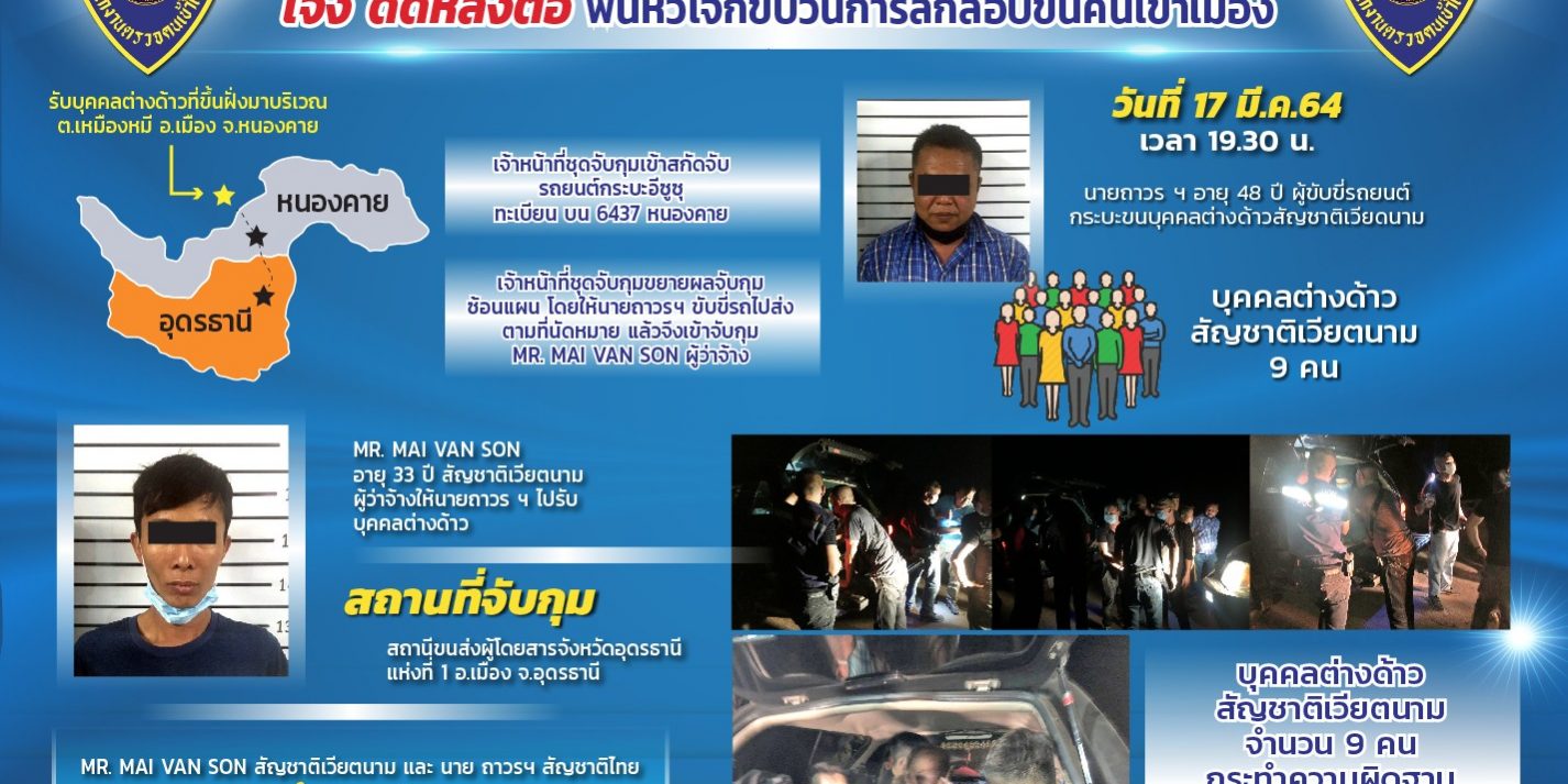 ตม.จ.หนองคาย ร่วมกับหน่วยงานที่เกี่ยวข้องจับกุมตัวนายถาวร อายุ 48 ปี สัญชาติไทย และ MR.MAI อายุ 33 ปี สัญชาติ เวียดนาม ในข้อหา “ร่วมกันให้ความช่วยเหลือ ซ่อนเร้น หรือช่วยด้วยประการใดๆ แก่คนต่างด้าวเข้ามาในราชอาณาจักรโดยผิดกฎหมายเพื่อให้พ้นจากการถูกจับกุม” พร้อมบุคคลต่างด้าวสัญชาติเวียดนามอีก 9 คน ในข้อหา “เป็นคนต่างด้าวเดินทางเข้ามาในราชอาณาจักร