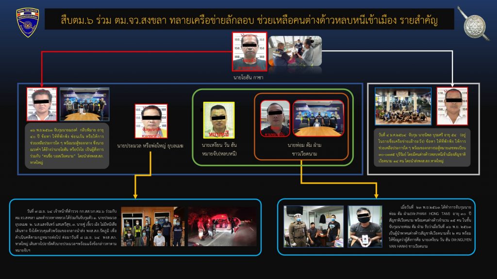 กก.สส.บก.ตม.6 ได้สืบทราบว่าจะมีการรับจ้างส่งคนต่างด้าวจากพื้นที่ กทม.มายังภาคใต้โดยใช้รถยนต์ส่วนตัว จึงได้วางแผนในการสกัดกั้นจับกุมโดยประสานการปฏิบัติกับ ตม.จ.สงขลา และ ส.ทล.3 กก.7 บก.ทล. (ตำรวจทางหลวงรัตภูมิ) ได้มีรถยนต์ทะเบียนกรุงเทพมหานคร ขับมาถึงบริเวณจุดกลับรถก่อนถึงหน่วยบริการประชาชนตำรวจทางหลวงรัตภูมิ ซึ่งเจ้าหน้าที่ได้ตั้งจุดสกัดเพื่อตรวจสอบยานพาหนะ ปรากฏว่ารถคันดังกล่าวได้กลับรถหลบหนีการตรวจสอบของเจ้าหน้าที่ จึงมีการไล่ติดตามจนจับกุมได้บริเวณริมถนนเพชรเกษมช่วง กม.1021-1022 ต.กำแพงเพชร อ.รัตภูมิ จ.สงขลา จากการตรวจสอบภายในรถพบนายประมวล เป็นผู้ขับขี่, น.ส.แสงจันทร์ นั่งโดยสารอยู่ตอนหลังของรถ (ฉายาในวงการ “พ่อใหญ่-แม่ใหญ่”),MR.XIAO ชาวจีนไม่มีหนังสือเดินทาง นั่งอยู่ที่นั่งตอนหน้าข้างคนขับ ท(ตรวจสอบจากระบบ BIOMETRICS ไม่พบข้อมูลการเดินทางเข้ามาในราชอาณาจักรอย่างถูกต้อง) จึงได้แจ้งข้อกล่าวหาว่า “ร่วมกันให้ที่พักพิง ซ่อนเร้น หรือช่วยด้วยประการใดๆ เพื่อให้คนต่างด้าวที่เข้าเมืองโดยผิดกฎหมายพ้นจากการจับกุม” และ “คนต่างด้าวเดินทางเข้ามาและอยู่ในราชอาณาจักรโดยไม่ได้รับอนุญาต” และยังพบว่านายประมวลฯ เป็นบุคคลตามหมายจับศาลจังหวัดสงขลาที่ 109/2564 ในความผิดฐาน ร่วมกันให้ที่พักพิง ซ่อนเร้น ช่วยเหลือหรือช่วยด้วยประการใดๆ ซึ่งเมื่อวันที่ 16 พ.ย.63 ดังกล่าวข้างต้น และรถยนต์ คันก่อเหตุ เป็นรถคันเดียวกันกับที่ใช้รับชาวเวียดนาม 2 คน ไปส่งยังท่าอากาศยานหาดใหญ่ในวันดังกล่าว และในส่วนของ น.ส.แสงจันทร์ หรือแม่ใหญ่ เป็นภรรยาของนายประมวล ซึ่งเจ้าหน้าที่ตรวจสอบข้อมูลพบว่ามีความเชื่อมโยงโดยเป็นผู้ติดต่อประสานงานกับขบวนการลักลอบขนแรงงานต่างด้าว เครือข่าย “โซติแอล” นายหน้านำพาคนต่างด้าวชาวกัมพูชาที่อยู่ระหว่างการหลบหนี
