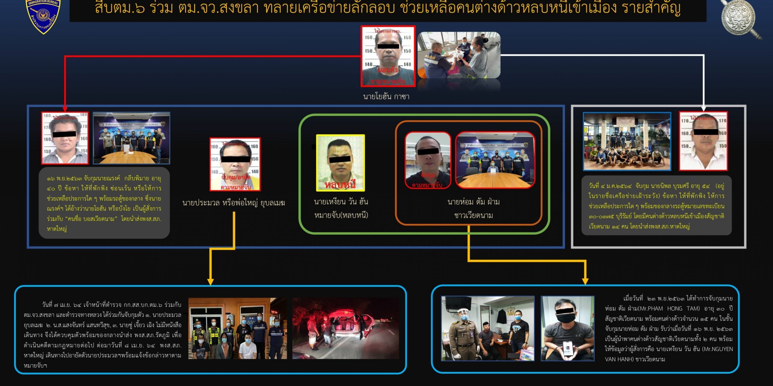เจ้าหน้าที่ตำรวจตรวจได้ร่วมกันจับกุมนายณรงค์ อายุ 40 ปี โดยกล่าวหาว่า “ให้ที่พักพิง ซ่อนเร้น หรือให้การช่วยเหลือประการใดๆ แก่คนต่างด้าวที่เดินทางเข้ามาผิดกฎหมาย เพื่อให้พ้นจากการจับกุมของพนักงานเจ้าหน้าที่” พร้อมรถตู้ที่ใช้กระทำความผิดทะเบียนกรุงเทพมหานคร นำส่ง พนักงานสอบสวน สภ.หาดใหญ่ ดำเนินคดีตามกฎหมาย ต่อมาจากการสืบสวนขยายผล และรวบรวมพยานหลักฐานทราบว่า นายณรงค์ได้รับการว่าจ้างจากนายโยฮัน หรือบังโย นำรถตู้ของกลางช่วยเหลือรับคนต่างด้าวสัญชาติเวียดนาม จำนวน 3 คน ไปพักไว้ที่รีสอร์ตแห่งหนึ่งใน อ.หาดใหญ่ จ.สงขลา จากนั้นนายประมวลฯ ได้มารับคนต่างด้าวสัญชาติเวียดนามจำนวน 2 คน จากรีสอร์ตดังกล่าวไปส่งยัง ท่าอากาศยานหาดใหญ่ โดยมีนายห่อง (HONG) อายุ 30 ปี และ