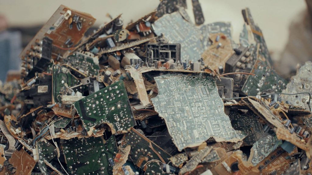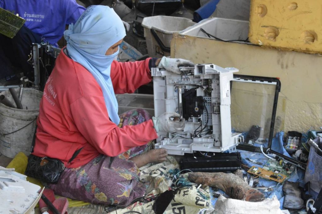ส่วนเศษวัสดุเหลือทิ้งคิดเป็นร้อยละ 22 ได้แก่ แก้ว,พลาสติกทนความร้อน,โฟมโพลียูรีเทน,ยาง,สารละลายน้ำเกลือ และสารทำความเย็น นอกจากนี้พบว่าในกระบวนการรื้อแยกและจัดการวัสดุบางประเภท เช่น การเผาสายไฟเพื่อให้ได้ทองแดง การทุบหน้าจอ CRT ในโทรทัศน์ เพื่อให้ได้เหล็ก และการกำจัดโฟมในตู้เย็นด้วยวิธีการเผา ทำให้เกิดการปนเปื้อนสู่สิ่งแวดล้อมและส่งผลต่อสุขภาพของชาวบ้านในชุมชน ซึ่งสอดคล้องกับผลการศึกษาสิ่งแวดล้อมด้านอากาศ,ดิน,น้ำผิวดิน และน้ำใต้ดินบริเวณพื้นที่ประกอบกิจกรรมรื้อแยกและพื้นที่โดยรอบที่เกี่ยวเนื่องกับการรื้อแยกขยะอิเล็กทรอนิกส์ ด้วยการวิเคราะห์โลหะหนัก 8 ชนิด ได้แก่ ทองแดง,นิกเกิล,สังกะสี,แมงกานีส,โครเมียม,แคดเมียม,ตะกั่ว และสารหนู พบว่าพื้นที่ประกอบกิจกรรมรื้อแยกมีแนวโน้มปริมาณโลหะหนักสูงกว่าในพื้นที่ที่ไม่ประกอบกิจกรรมรื้อแยก โดยเฉพาะบริเวณในสถานที่ทิ้งขยะที่มีกิจกรรมการทุบหน้าจอ CRT และการเผาสายไฟพบปริมาณโลหะหนักสูงที่สุด จากผลการศึกษาทำให้ทราบว่าการประกอบอาชีพอาจก่อให้เกิดผลกระทบต่อสุขภาพของผู้ประกอบการ ประชาชนที่อาศัยอยู่ใกล้เคียง อีกทั้งยังสามารถก่อให้เกิดผลกระทบต่อสิ่งแวดล้อมและระบบนิเวศในชุมชนอีกด้วย