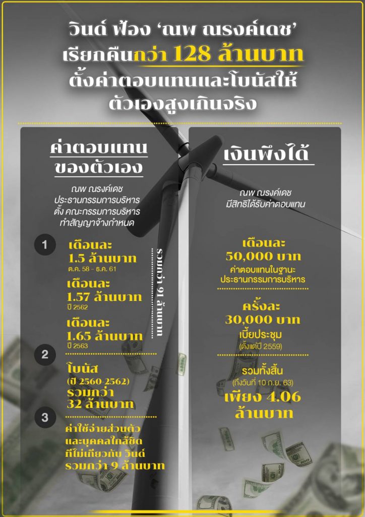 เมื่อวันที่ 24 เมษายน 2564 ผู้สื่อข่าวรายงานว่า บริษัท วินด์ เอนเนอร์ยี่ โฮลดิ้ง จำกัด บริษัทพลังงานลมยักษ์ใหญ่ในภูมิภาคอาเซียน ได้ฟ้องร้องนายณพ ณรงค์เดช อดีตผู้บริหาร ที่ถูกปลดโดยมติที่ประชุมสามัญผู้ถือหุ้นเมื่อวันที่ 10 กันยายน 2563 ต่อศาลแพ่ง เรียกค่าเสียหายกว่า 128 ล้านบาท หลังจากที่ผู้บริหารชุดใหม่นำโดยนายประเดช กิตติอิสรานนท์ ได้ตั้งคณะกรรมการตรวจสอบการตั้งค่าตอบแทน การอนุมัติเบิกค่าใช้จ่ายต่างๆ ของนายณพฯ ขณะที่ยังเป็นกรรมการบริษัท ตามที่ผู้ถือหุ้นมีหนังสือร้องขอให้ดำเนินการ และพบว่ามีการตั้งค่าตอบแทนอดีตผู้บริหารสูงเกินจริง รวมทั้งมีการเบิกค่าใช้จ่ายที่ไม่เกี่ยวข้องกับบริษัท ส่อไปในทางทุจริต ทำให้บริษัทได้รับความเสียหาย