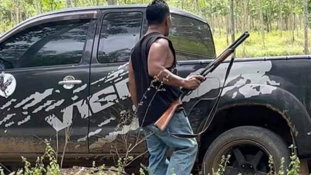 วันที่ 23 เมย.64 นายทองหลางหลาง พิลาโท อายุ 63 ปี อยู่บ้านเลขที่ 67/9 ม.9 ต.ย่านรี อ.กบินทร์บุรี จ.ปราจีนบุรี อดีตกำนัน ต.ย่านรี ชี้แจงต่อสื่อมวลชนว่าเมื่อเช้าวันที่ 18 เมย.64 ขณะที่ตนกำลังกลับจากสวนยางพาราเห็นกลุ่มคนกำลังขุดกลุมปักเสารั้วซึ่งเป็นที่ดินที่มีข้อพิพาทกันอยู่จึงจอดรถลงสอบถามกลุ่มคนดังกล่าวทราบว่า เป็นลูกชายนายณัฐพรม ภูมิทองดีประสิทธิ์ จึงมาสอบถามว่าใครใช้ให้มาปักหลักเสาบริเวณนี้อย่าเพิ่งปักเสาเพราะที่แปลงนี้มีข้อพิพาทกันอยู่และถามว่าใครให้มาปักเสารั้ว ได้รับคำตอบว่าพ่อให้ปักจึงบอกให้หยุดปักเสาจากนั้นได้โทรแจ้งกำนัน ต.เขาไม้แก้วซึ่งเป็นพื้นที่รับผิดชอบให้มาช่วยตรวจสอบ จากนั้นมีการโต้เถียงกันกลุ่มลูกชายนายณัฐพรมโทรศัพท์บอกพ่อให้มาพบด่วนรับด้วยและถ่ายคลิปไลฟ์สด ต่อมาพ่อของเด็กในคลิปขับรถยนต์มาพร้อมกับอาวุธปืนลูกซองยาวลงมาตะโกนถามว่าจะคุยกันดีๆไม่ได้หรือ ปิดล้อมลูกผมทำไม ขณะนั้นลูกชายและสารวัตรกำนัน ต.เขาไม้แก้ว เห็นถือปืนลงมาตกใจมาดลูกชายกำนันหลางจึงเดินกลับมาที่รถพร้อมกับเปิดประตูรถกระบะสีดำเอาอาวุธปืนลูกซองยาวออกมาถือพร้อมกับบอกว่าก็มีปืนเหมือนกันจากนั้นได้เอาปืนเก็บไว้ในรถแล้วเดินออกมาจากตัวรถและถกเถียงกันไปมา อึดใจต่อมากลุ่มที่มาปักเสาขับรถออกจากที่เกิดเหตุไปกลุ่มของกำนันหลางบอกว่าอย่าเพิ่งไปเพราะเอาปืนออกมาข่มขู่ปืนมีทะเบียนหรือไม่