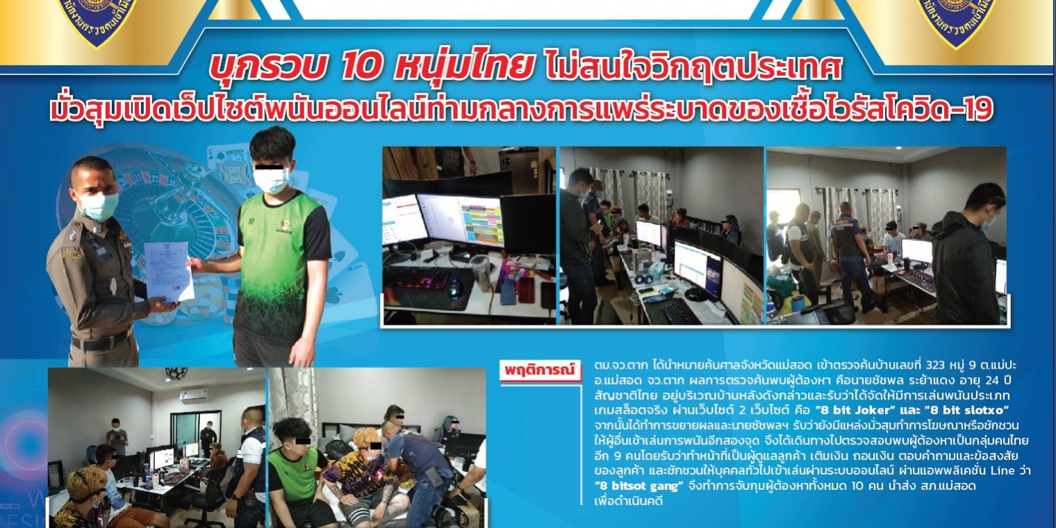 โดยนายชัชพลฯ รับว่ายังมีแหล่งมั่วสุมทำการโฆษณาหรือชักชวนให้ผู้อื่นเข้าเล่นการพนันอีกสองจุด คือ บ้านหลังหนึ่งใน ม.9 ต.แม่ปะ อ.แม่สอด จ.ตาก และ บ้านหลังหนึ่งใน ม.10 ต.แม่ปะ อ.แม่สอด จ.ตาก จึงได้เดินทางไปตรวจสอบพบผู้ต้องหาเป็นกลุ่มคนไทย อีก 9 คน กำลังจัดให้มีการเล่นพนันออนไลน์ประเภทเกมสล็อต ผ่านเว็บไซต์ 2 เว็บไซต์ คือ “8 bit Joker” และ “8 bit slotxo” เช่นเดียวกันกับบ้านหลังแรก โดยรับว่าทำหน้าที่เป็นผู้ดูแลลูกค้า เติมเงิน ถอนเงิน ตอบคำถามและข้อสงสัยของลูกค้า และชักชวนให้บุคคลทั่วไปเข้าเล่นผ่านระบบออนไลน์ ผ่านแอพพลิเคชั่น Line ว่า “8 bitsot gang” จึงทำการจับกุมผู้ต้องหาทั้งหมด 10 คน เป็นชาย 7 หญิง 3 ราย จึงนำตัวส่งพนักงานสอบสวน สภ.แม่สอด เพื่อดำเนินคดีตามกฎหมายต่อไป