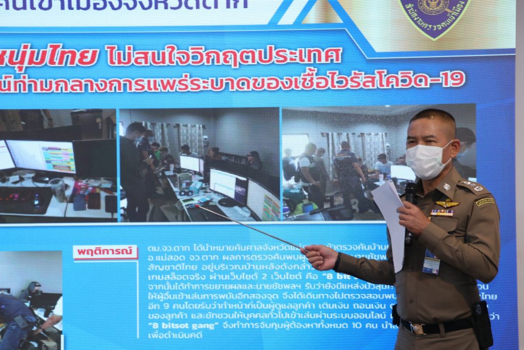 ร่วมกันแถลงข่าว เจ้าหน้าที่ ตม.จ.ตาก ได้นำหมายค้นศาลจังหวัดแม่สอด เข้าตรวจค้นบ้านหลังหนึ่งใน ต.แม่ปะ อ.แม่สอด จ.ตาก ผลการตรวจค้นพบผู้ต้องหา คือ นายชัชพลฯ อยู่บริเวณบ้านหลังดังกล่าวและรับว่าได้จัดให้มีการเล่นพนันประเภทเกมสล็อตจริง ผ่านเว็บไซต์ 2 เว็บไซต์ คือ “8 bit Joker” และ “8 bit slotxo” โดยผู้ต้องหารับว่าทำหน้าที่เป็นผู้ดูแลเว็บไซต์พนันออนไลน์ และรับว่าได้ร่วมกันจัดให้มีการเล่นพนันออนไลน์ประเภทเกมสล็อตจริง จากนั้นได้ทำการขยายผล