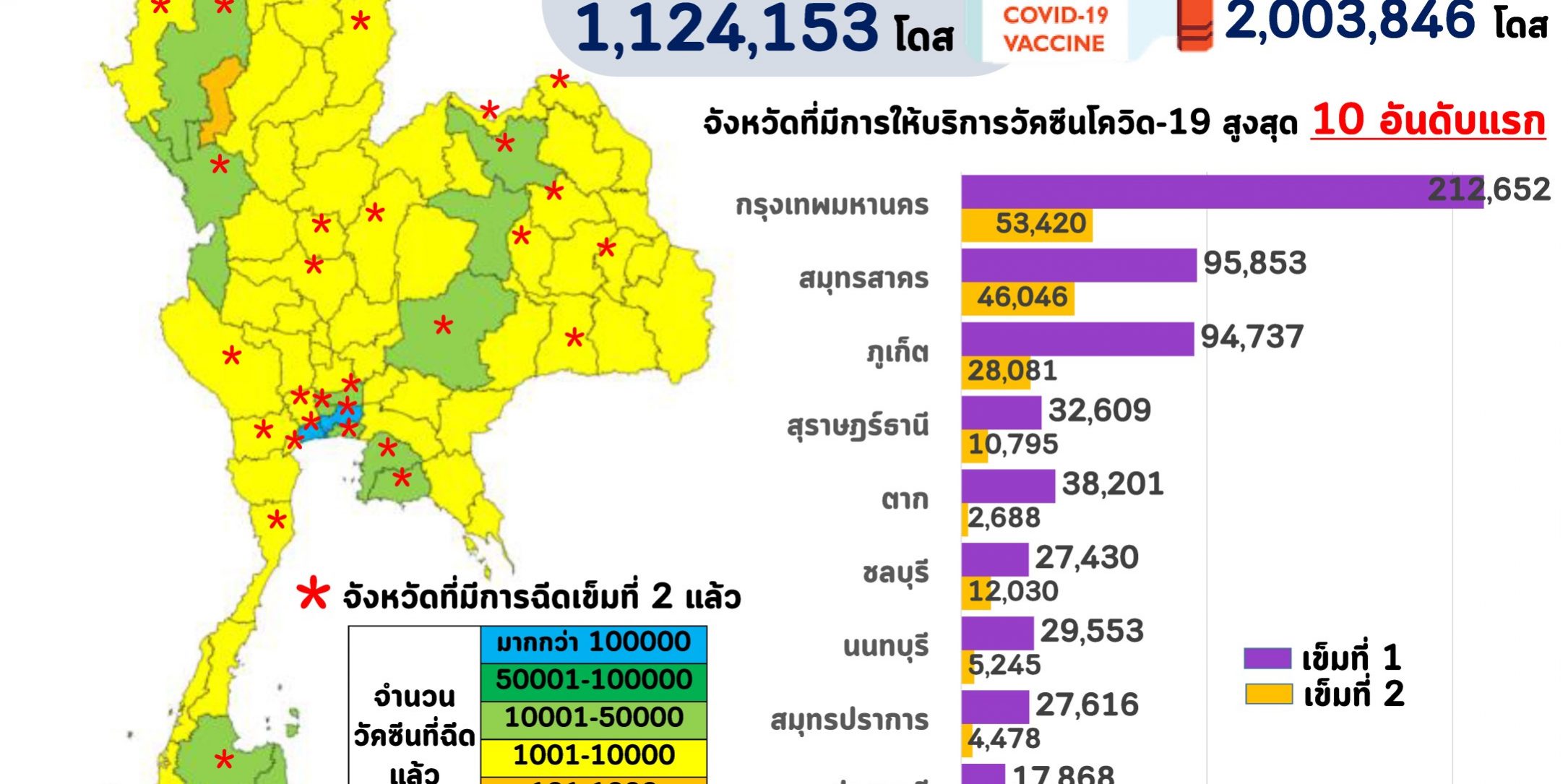 8.ข้อมูลการฉีดวัคซีนล่าสุดของประเทศไทย ได้จัดส่งวัคซีนแล้วจำนวน 2,003,846 โดส จำนวนการฉีดวัคซีนสะสม 1,124,153 โดส ณ วันที่ 25 เมษายน 2564 แบ่งเป็นเข็มแรก 949,124 โดส และเข็มสอง 175,029 โดส โดยฉีดแล้วครบทุกจังหวัด หากพิจารณาจากผู้ที่ได้รับวัคซีนแล้วอย่างน้อย 1 โดส จะมีจำนวน 949,124 คน หรือเท่ากับ 1.43% ของประชากร