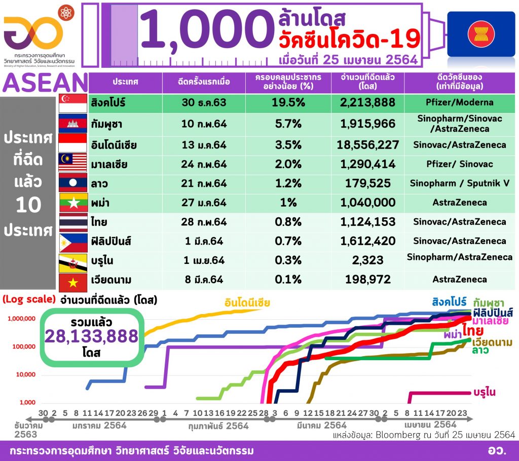 ในขณะที่ทุกประเทศในอาเซียนได้ฉีดวัคซีนแล้วรวมกันมากกว่า 28 ล้านโดส โดยสิงคโปร์เป็นประเทศที่ฉีดวัคซีนในสัดส่วนมากที่สุดครอบคลุมเกือบ 1 ใน 5 ของประชากร ส่วนอินโดนีเซียฉีดวัคซีนจำนวนมากที่สุดถึง 18.5 ล้านโดส