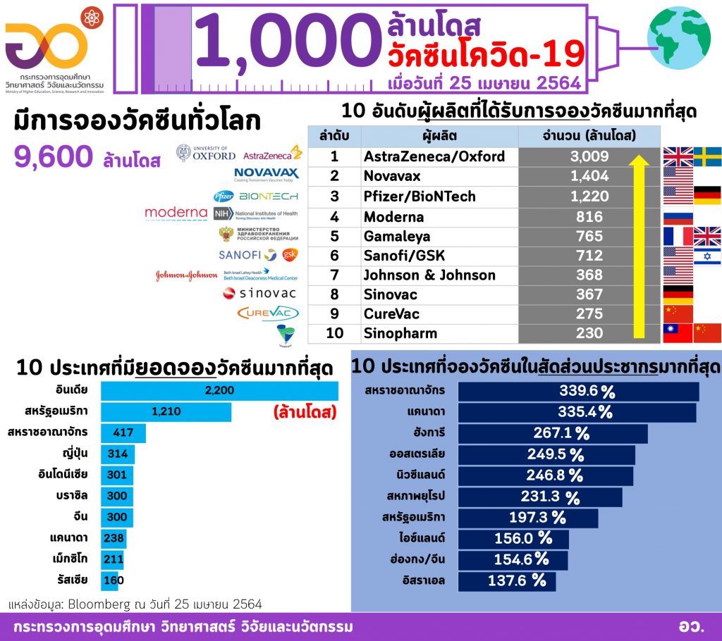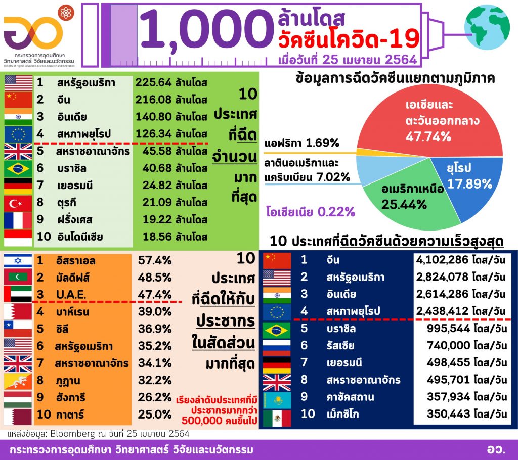 วันที่ 25 เมษายน 2564 : ศาสตราจารย์ ดร.นายแพทย์ สิริฤกษ์ ทรงศิวิไล ปลัดกระทรวงการอุดมศึกษา วิทยาศาสตร์ วิจัยและนวัตกรรม (อว.) เปิดเผยว่า “ขณะนี้ได้มีการฉีดวัคซีนโควิด-19 ทั่วโลก แล้วถึงระดับ 1,000 ล้านโดส ใน 191 ประเทศ/เขตปกครอง ใช้เวลาเพียง 138 วัน เร็วที่สุดในประวัติศาสตร์ โดยความเร็วในการฉีดรวดเร็วเพิ่มขึ้นอย่างต่อเนื่อง ซึ่ง 500 ล้านโดสแรกใช้เวลา 108 วัน ในขณะที่ 500 ล้านโดสหลัง ใช้เวลาเร็วขึ้น 3 เท่า เพียง 30 วันเท่านั้น”