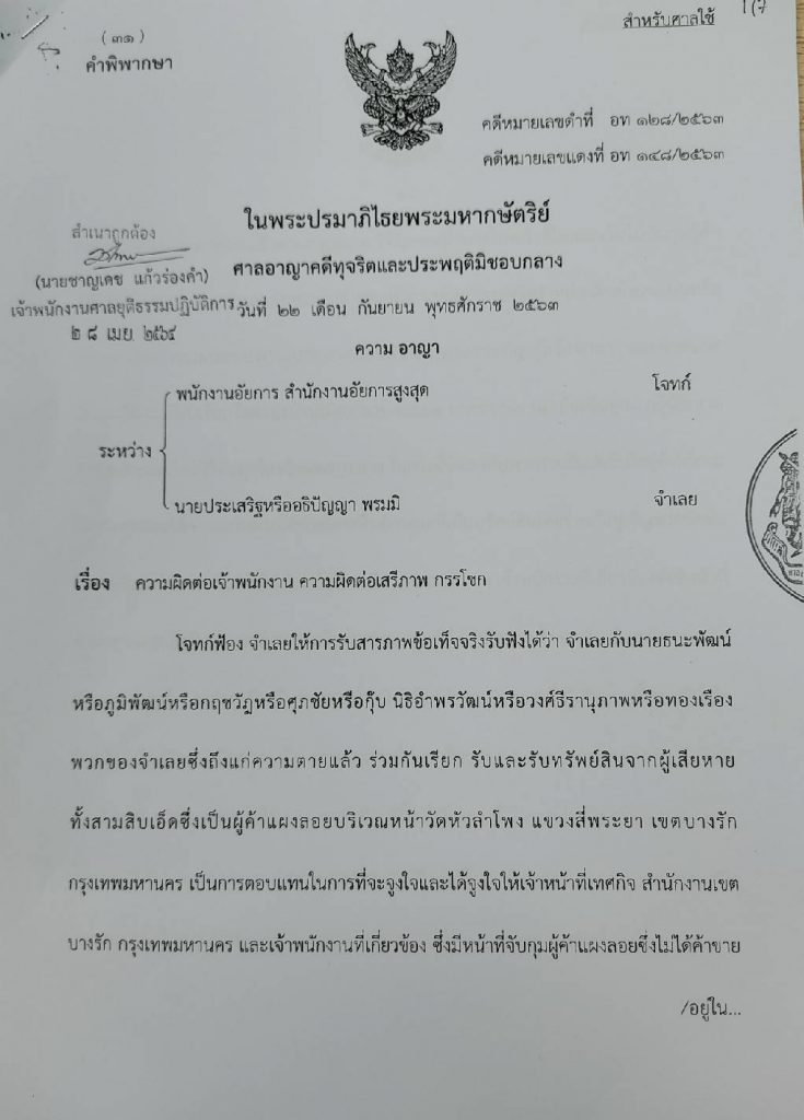 สำหรับคดีนี้มี พ.ต.ต.พรรษวุฒ สุวานิช อัยการปราบปรามการทุจริต 1 เป็นผู้ฟ้องคดี นายประเสริฐ หรือ อธิปัญญา พรมมี หรือยิ้ม หัวลำโพง ผู้เดินเรียกเก็บเงินค่าแผงผู้ค้าหาบเร่
