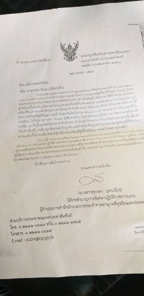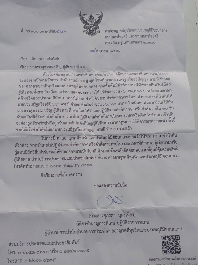 ซึ่งศาลมีคำสั่งแจ้งออกคำบังคับให้ผู้เสียหาย 31 รายทราบว่าจะได้เงินคืนจากจำเลยคนละเท่าใด ซึ่งนโยบายของศาลนี้ถือเป็นเรื่องที่เป็นประโยชน์กับผู้เสียหายมากที่ทำให้ผู้เสียหายได้รู้สิทธิ์ที่จะได้รับคืนค่าเสียหาย นายวัชระ จึงช่วยประสานงานกับเจ้าหน้าที่ศูนย์คุ้มครองสิทธิผู้เสียหาย ศาลทุจริตฯ ขอคัดคำฟ้อง คำพิพากษา คำบังคับและอื่นๆในสำนวนเพื่อดำเนินการให้ความยุติธรรมกลุ่มผู้ค้าหาบเร่แผงลอยหน้าวัดหัวลำโพงต่อไป
