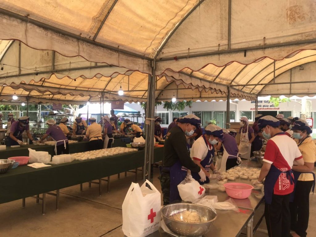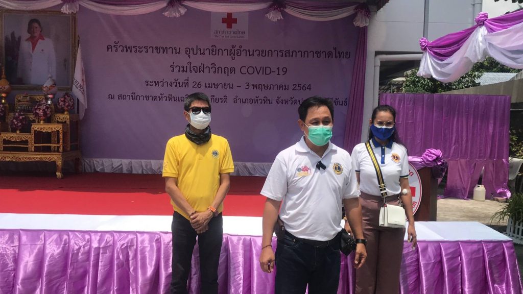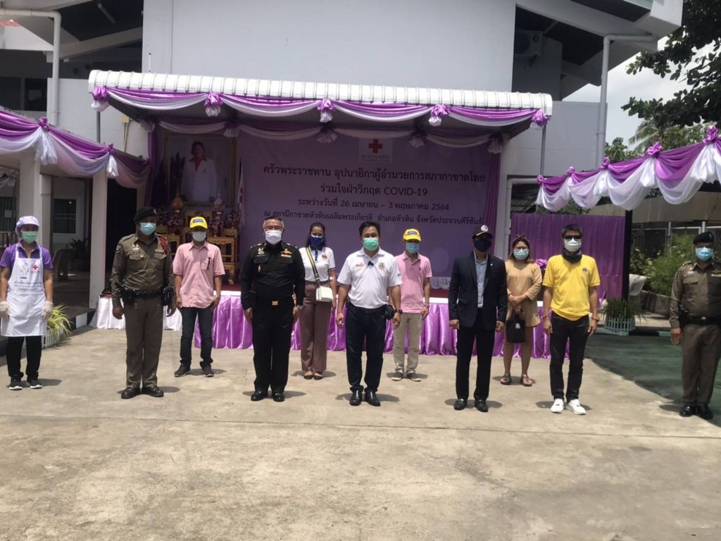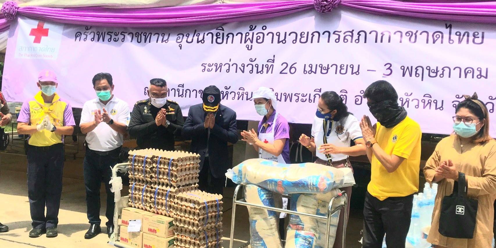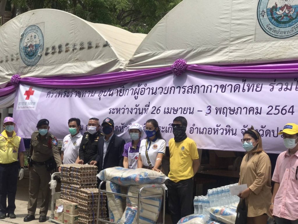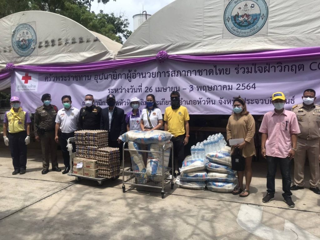 ได้ร่วมกันมอบข้าวสาร,ไข่ไก่,น้ำมันพืช และน้ำดื่ม ซึ่งได้รับการสมทบทุนจากผู้ใจบุญหลายภาคส่วน ให้โรงครัวพระราชทานสภากาชาดไทย ที่ตั้งขึ้น ณ สถานีกาชาดเฉลิมพระเกียรติหัวหิน ซึ่งได้ปรุงอาหารพระราชทานฯวันละ 3,000 กล่อง ไปแจกจ่ายให้กับผู้ป่วยโรคโควิด-19 ที่ถูกกักตัว หรือพักรักษาอยู่ในโรงพยาบาล หรือโรงพยาบาลสนาม ผู้เจ็บป่วย คนพิการ ผู้ด้อยโอกาสที่ประสบภัยได้รับผลกระทบจากโรคโควิด-19