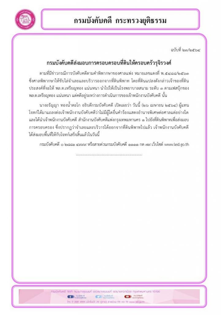 นางอรัญญา ทองน้ำตะโก อธิบดีกรมบังคับคดี เปิดเผยว่า เมื่อวันที่ 26 เมษายน 2564 ผู้แทนโจทก์ได้มาแถลงต่อเจ้าพนักงานบังคับคดีว่าไม่มีผู้ใดยื่นคำร้องแสดงอำนาจพิเศษต่อศาลแต่อย่างใด และได้นำเจ้าพนักงานบังคับคดี สำนักงานบังคับคดีแพ่งกรุงเทพมหานคร 1 ไปยังที่ดินพิพาทเพื่อส่งมอบการครอบครอง ซึ่งปรากฏว่าจำเลยและบริวารได้ออกจากที่ดินพิพาทไปแล้ว เจ้าพนักงานบังคับคดีได้ส่งมอบพื้นที่ให้กับโจทก์เสร็จสิ้นแล้วในวันนี้